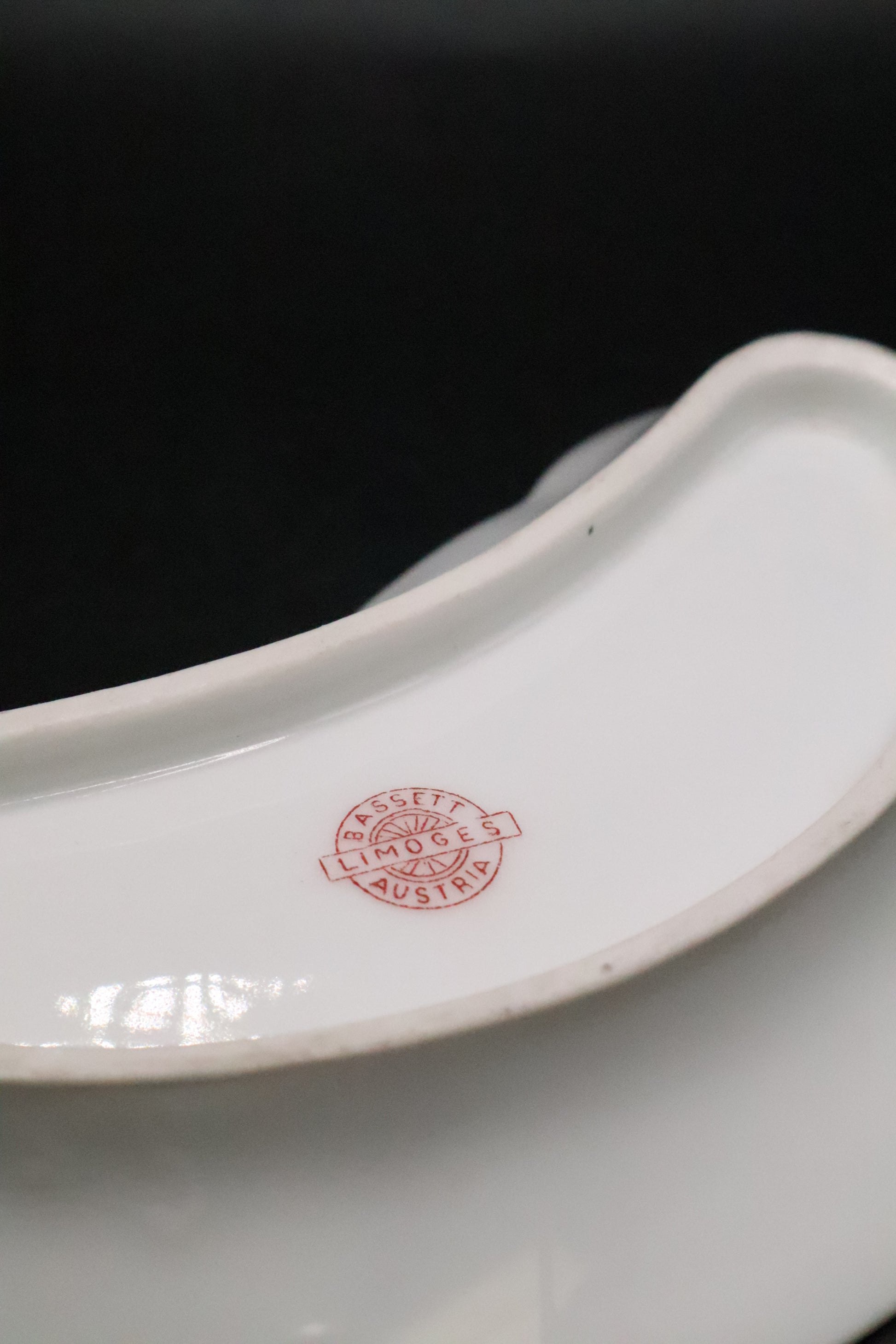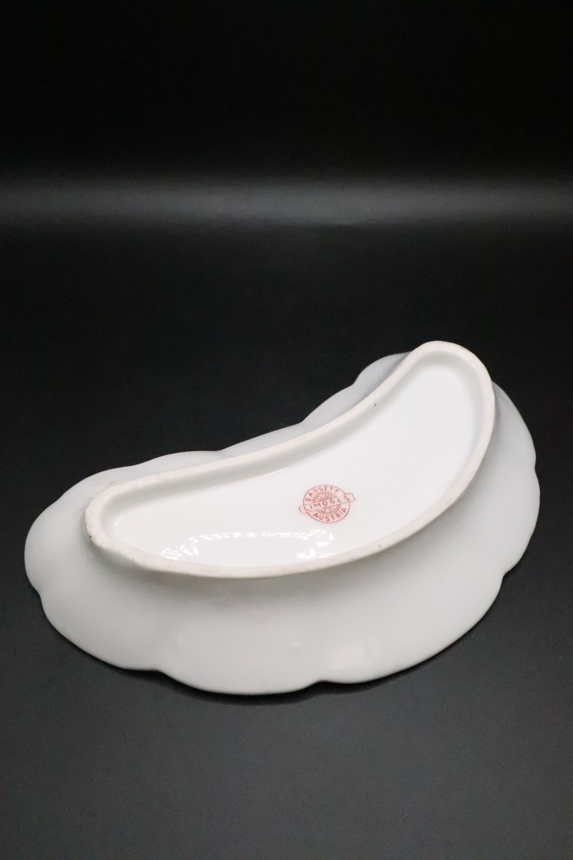 This elegant set of three bone dishes showcases the refined craftsmanship of Bassett Austria's Limoges porcelain collection. Each piece features delicate hand-painted floral motifs rendered in soft, naturalistic hues that exemplify early 20th-century decorative arts. The crescent-shaped design is characteristic of period tableware, originally intended for serving oysters or other shellfish at formal dining occasions. The fine porcelain body displays the translucent quality and smooth glaze typical of authentic Limoges production. A distinguished addition to any collection of vintage European ceramics or formal table settings, these dishes represent quality artisanal porcelain work from a respected Austrian manufacturer.
