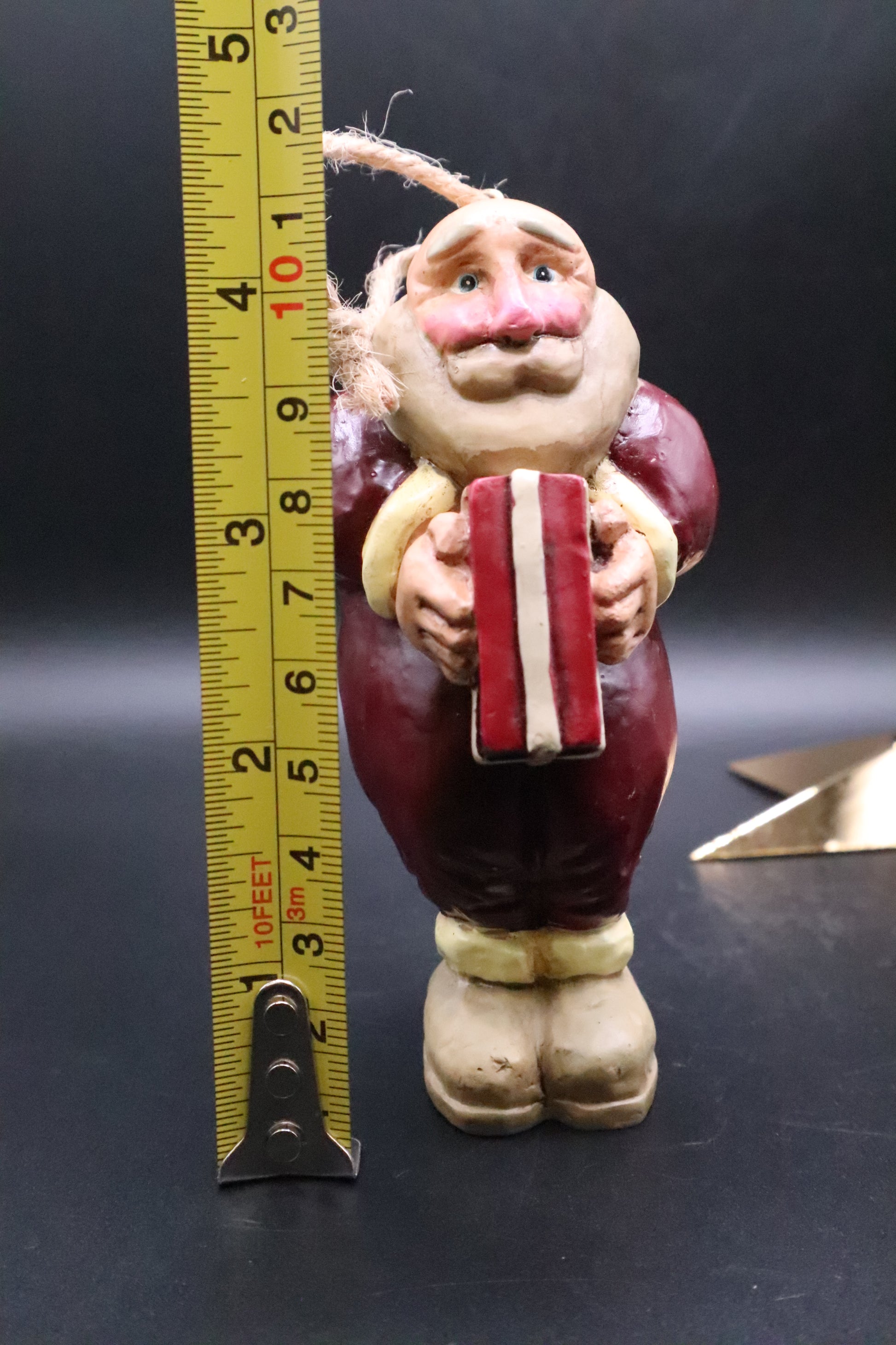 This vintage Santa ornament embodies classic holiday charm with its carefully rendered ceramic form. The figure depicts Father Christmas in a generous moment, presenting a wrapped gift—a timeless symbol of yuletide generosity. Crafted with the precision characteristic of mid-century holiday collectibles, the piece features hand-painted details and warm glazing that captures authentic seasonal warmth. Perfect for discerning collectors who appreciate authentic vintage Christmas décor, this ornament adds narrative depth and nostalgic elegance to any holiday display or curated collection.