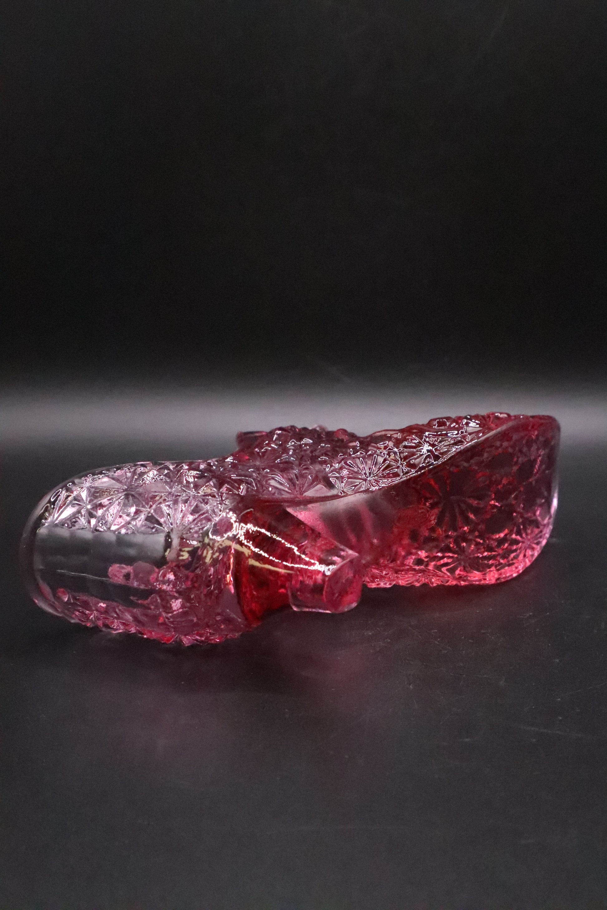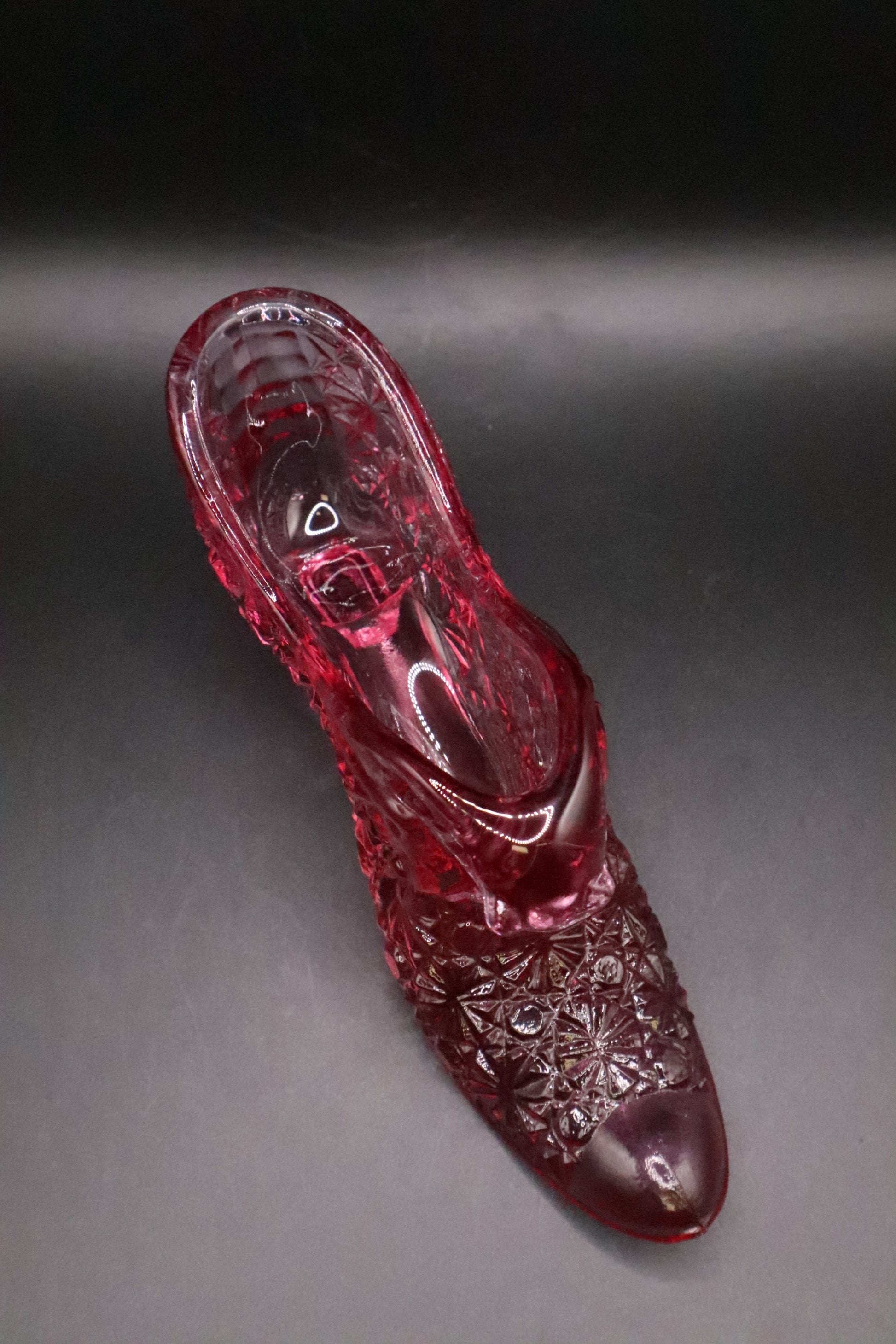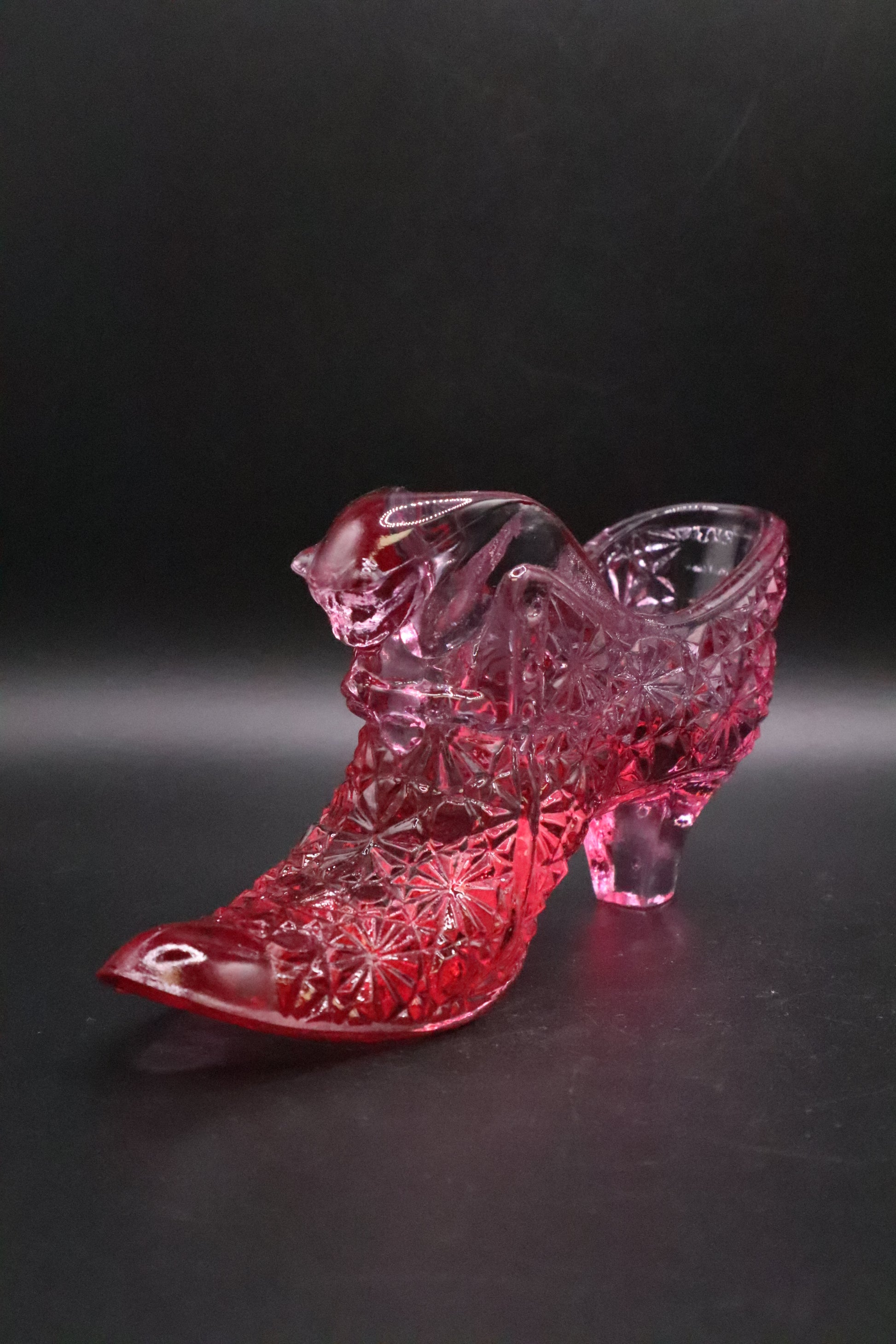 This charming Fenton glass cat head shoe showcases the artistry of vintage glassware craftsmanship. Rendered in a delicate rose pink hue, this decorative piece captures feline features with graceful detail. Fenton Glass, renowned for its hand-crafted quality and vibrant colors, produced these whimsical novelty shoes as collectible treasures. Perfect for vintage glass enthusiasts, this cat head shoe serves as an elegant display piece that celebrates mid-century American glassmaking heritage. A distinctive addition to any antique collection.