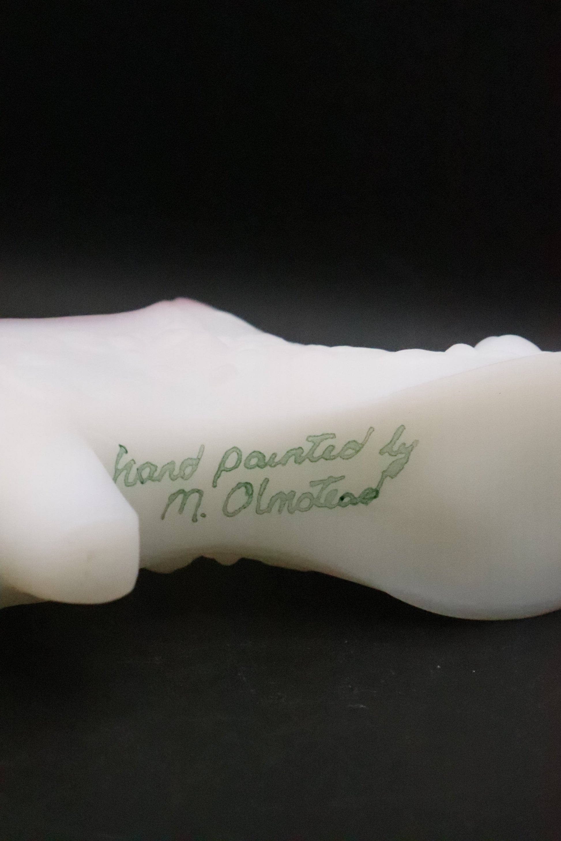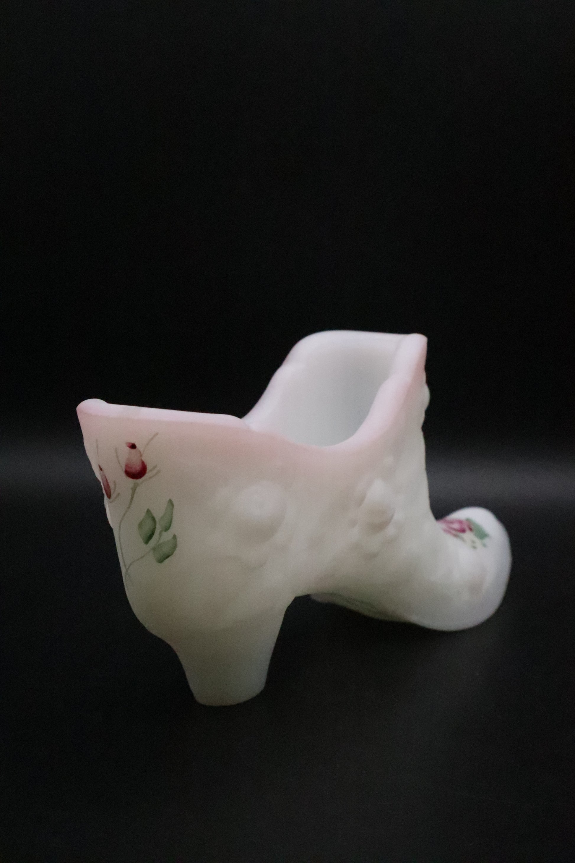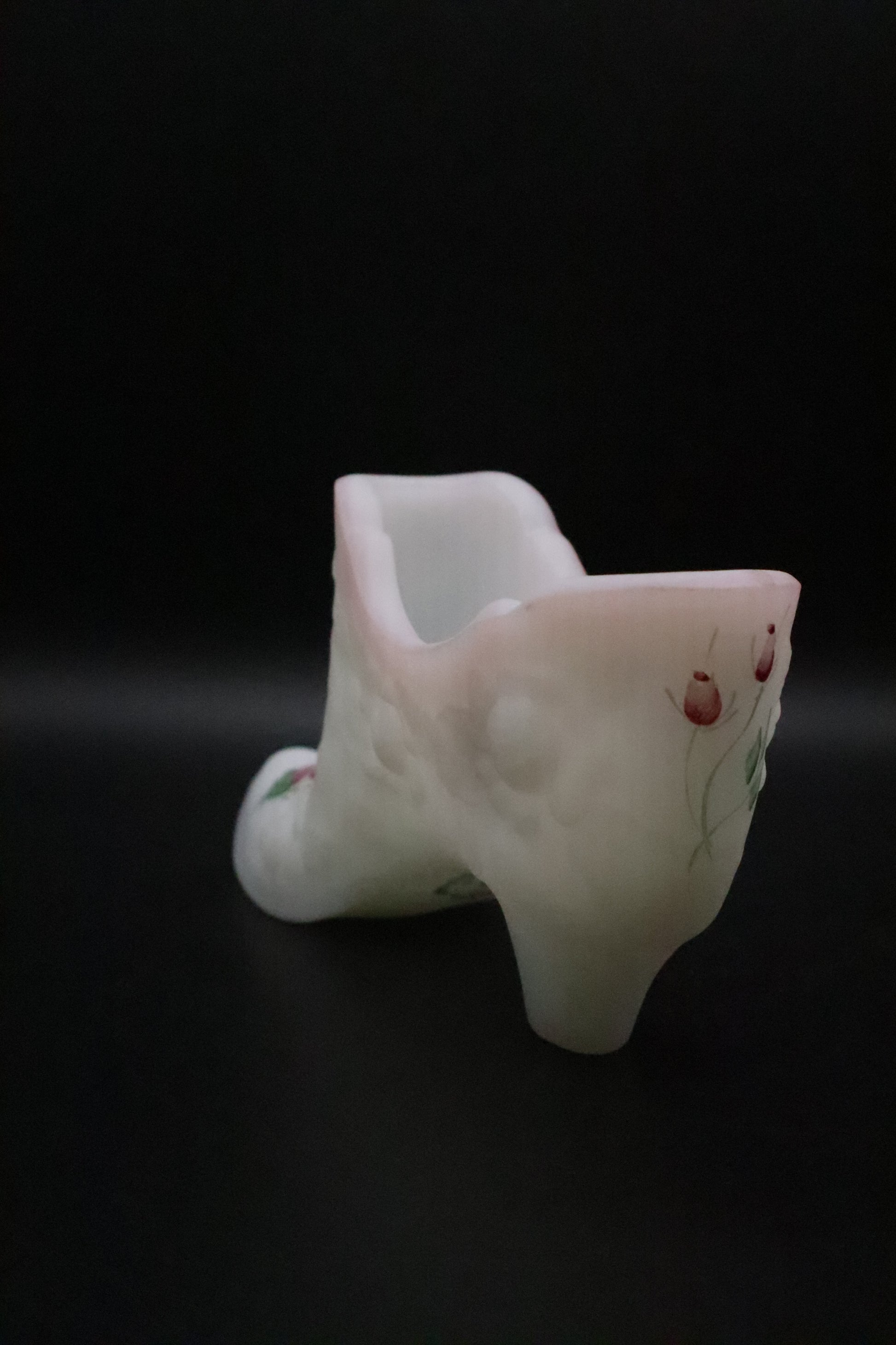 Fenton white satin slippers showcase delicate rose floral artistry characteristic of this renowned glassware maker's craftsmanship. The satin finish provides a soft, elegant aesthetic while the intricate floral design adds vintage charm. Perfect for collectors of Fenton glass or those seeking a refined decorative piece with timeless appeal. These slippers reflect the quality and attention to detail that made Fenton a beloved name in American glass production.