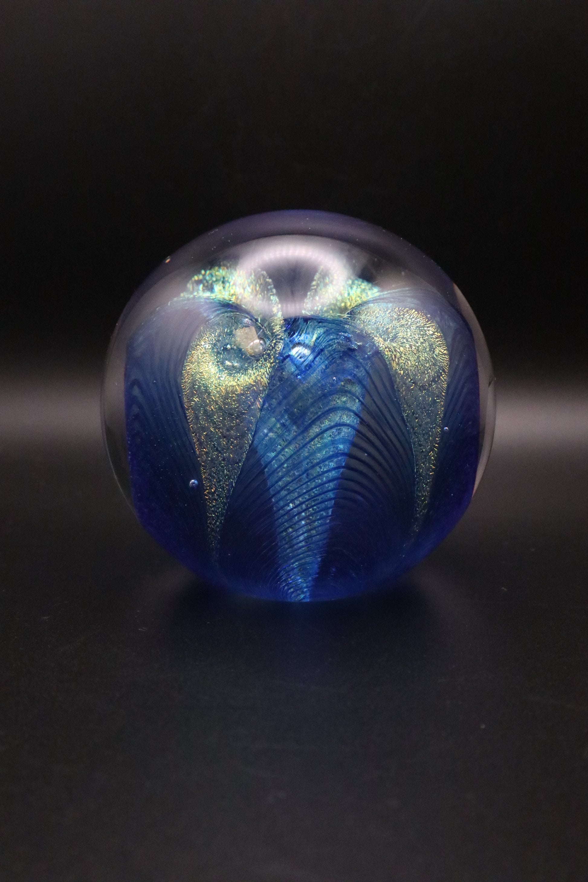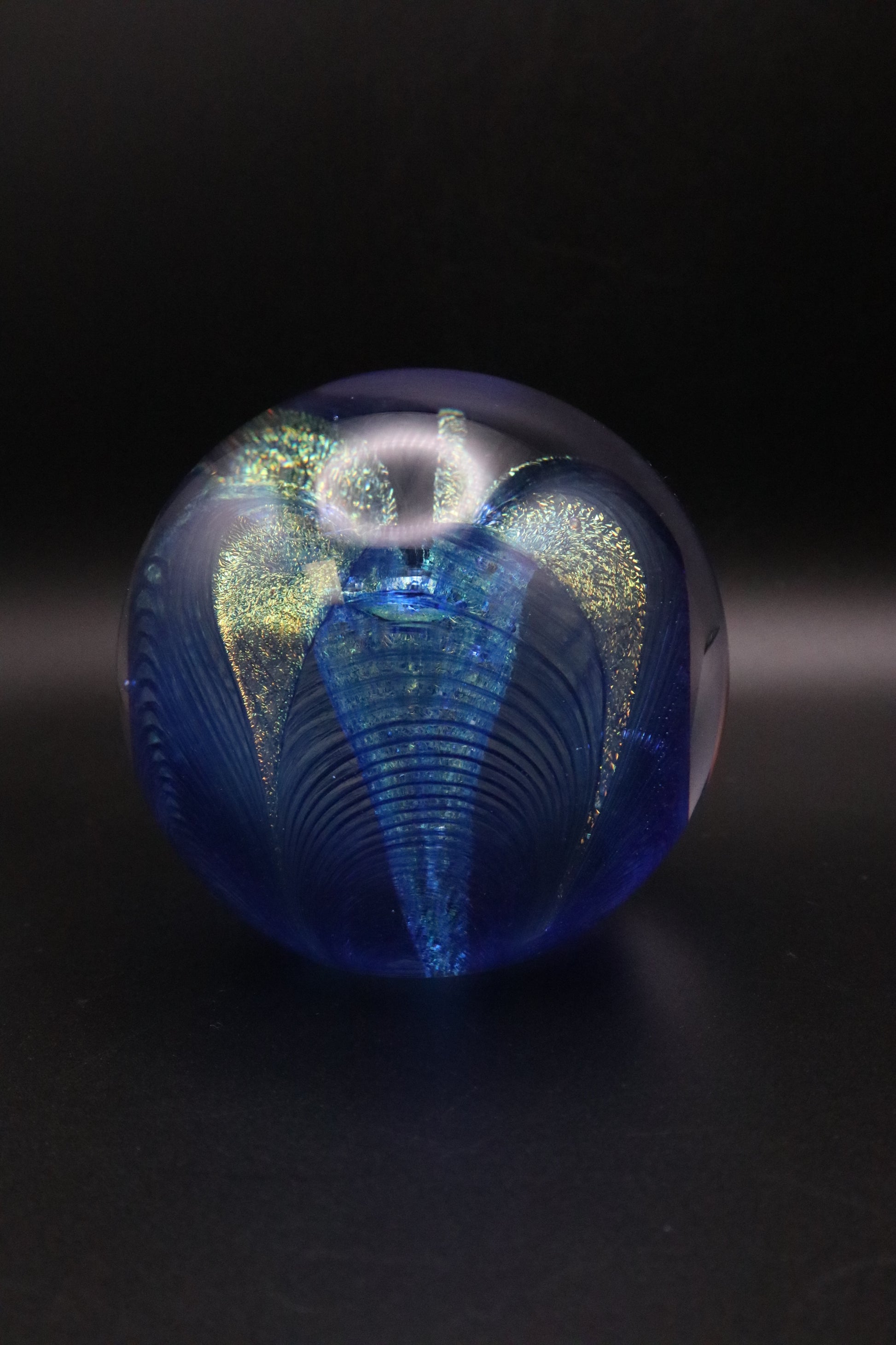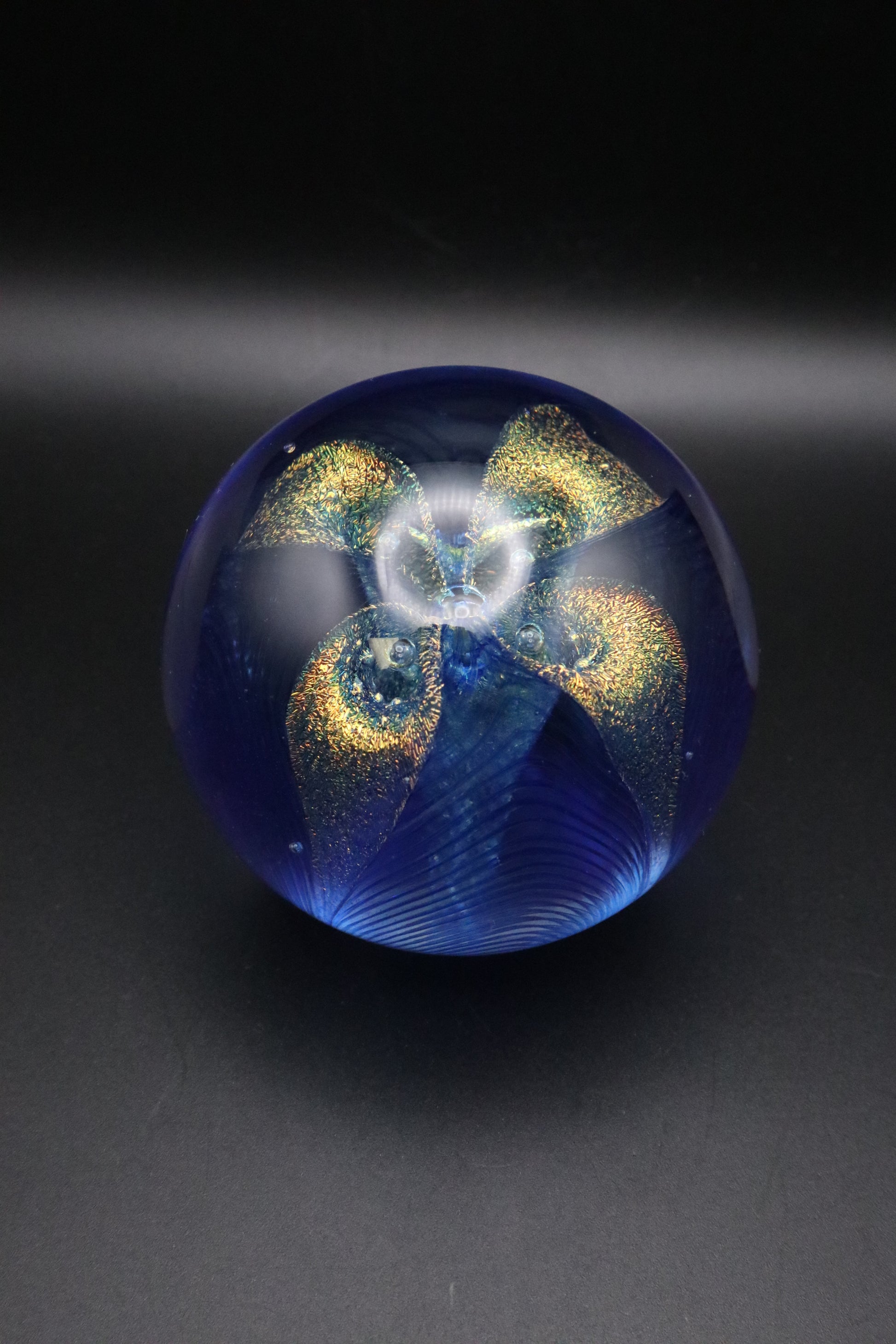 GLASS EYE STUDIO HAND BLOWN METALLIC BLUE WITH GOLD FLOWER PAPERWEIGHT
