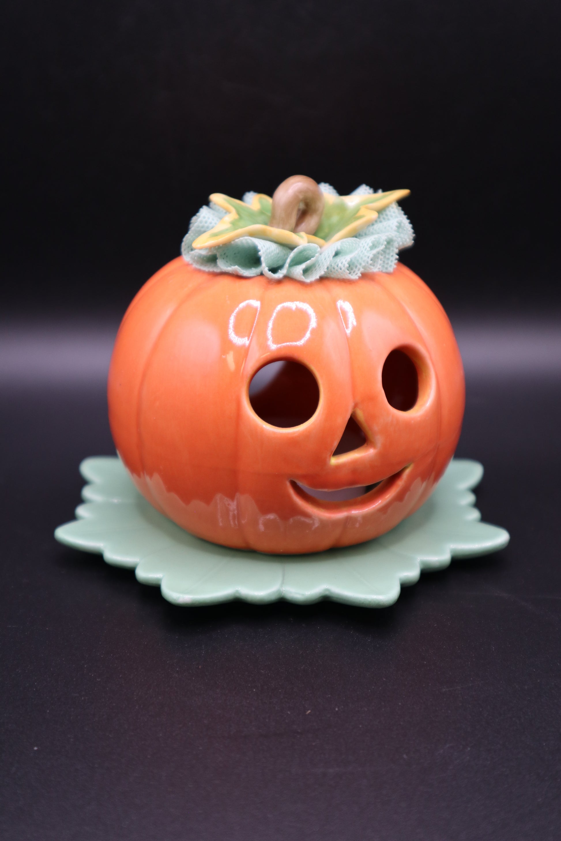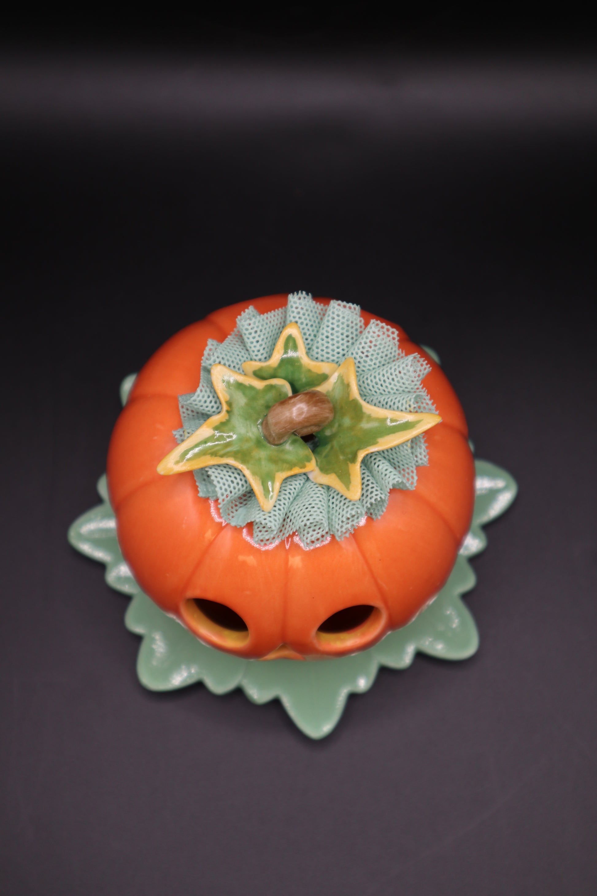 This Irish Dresden Jack O’ Lantern votive holder blends classic Halloween charm with delicate craftsmanship. Made from fine porcelain, it features intricate lace detailing that adds an elegant touch to its festive design. Perfect for creating a warm, ambient glow, this piece serves as a refined decoration for seasonal celebrations, combining both artistry and tradition in one collectible item.