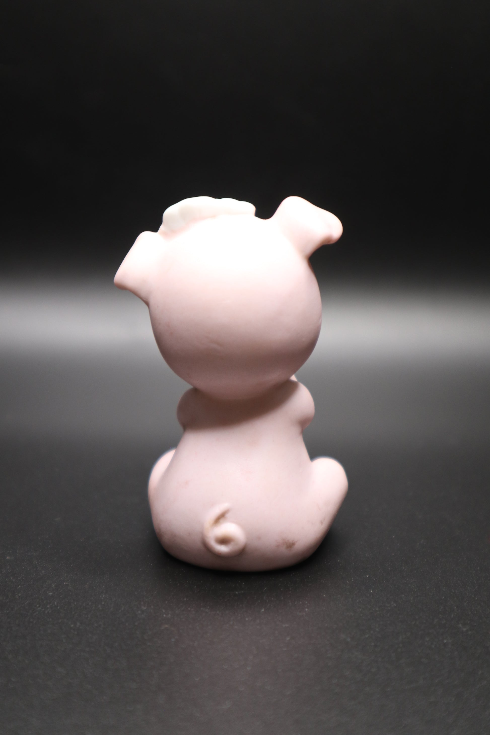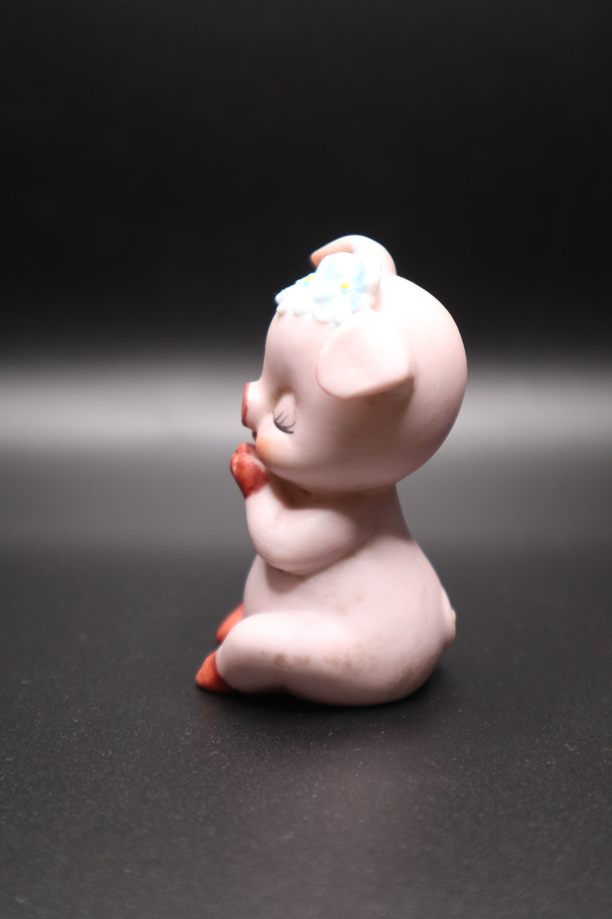 This 1975 Josef Originals George Good mini pig, adorned with a delicate blue flower, is preserved in good condition, reflecting its vintage charm and collectible value.