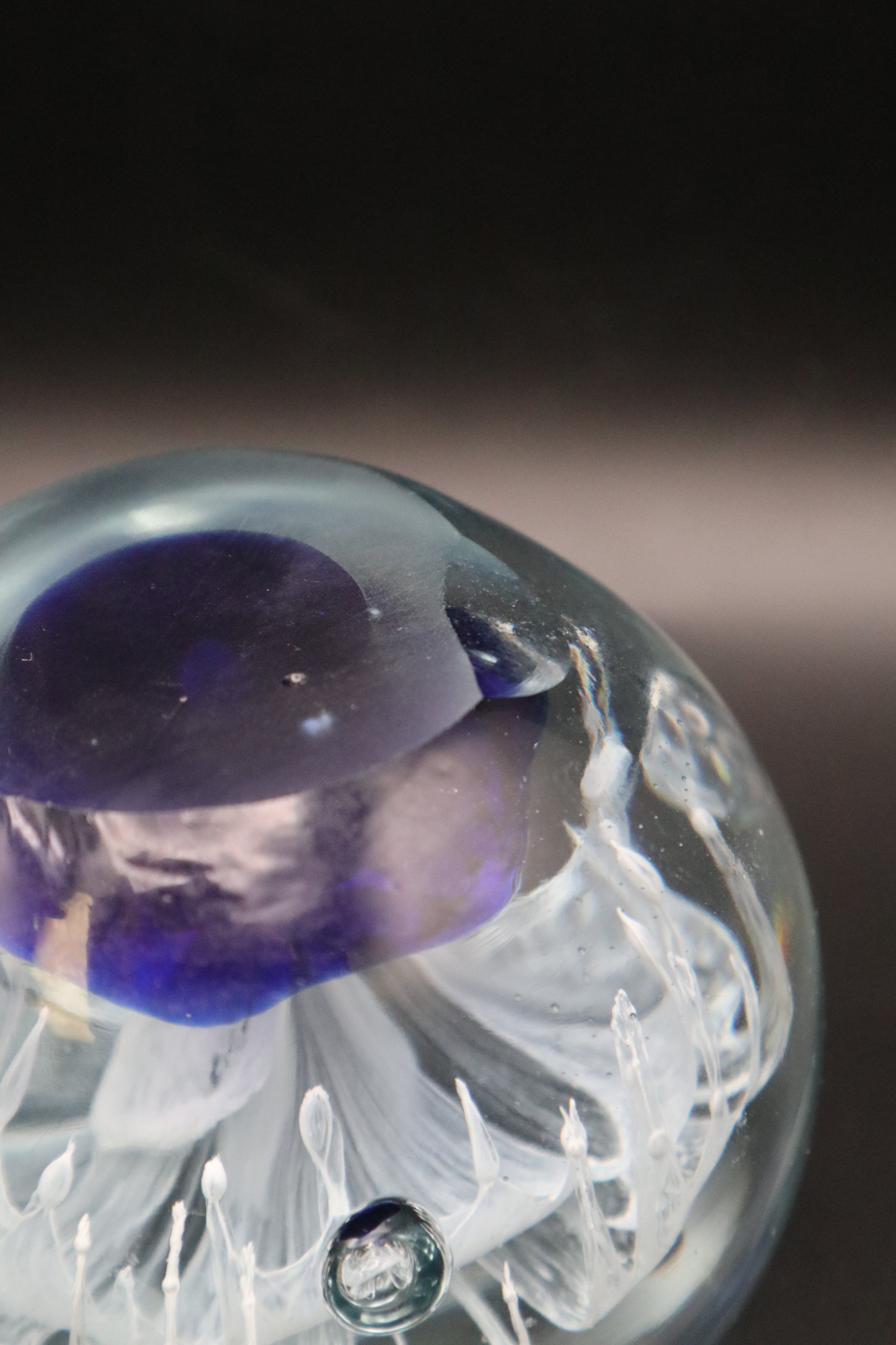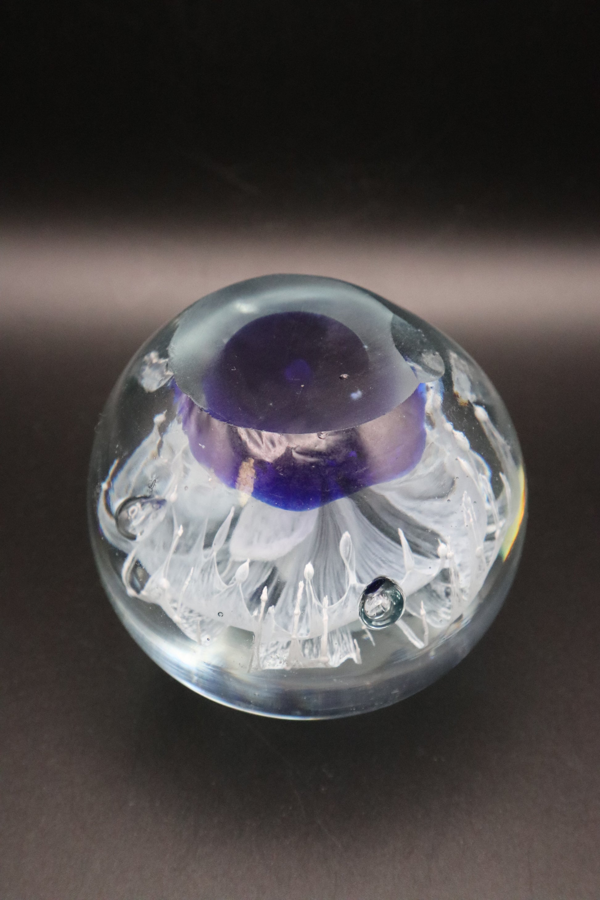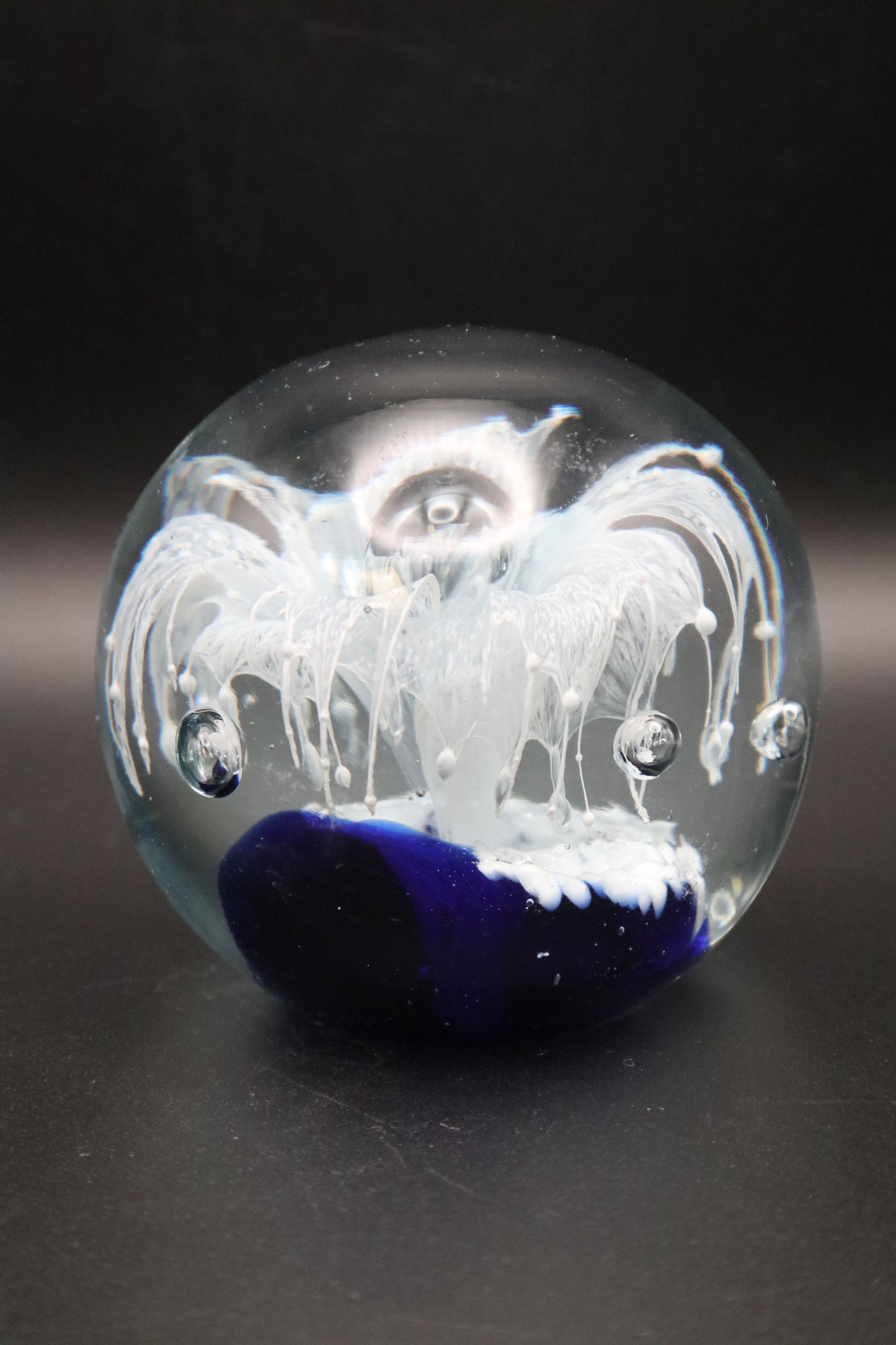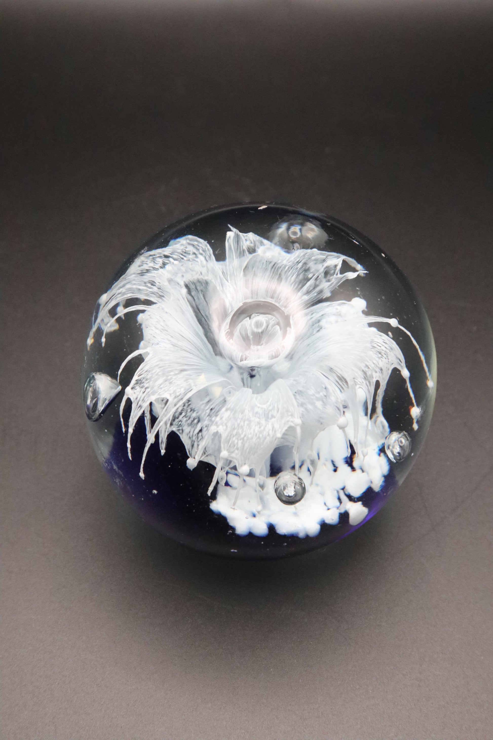 This vintage cobalt blue art glass paperweight features an expertly crafted white flower encapsulated within its smooth, polished surface. The striking contrast between the deep blue and delicate white flower showcases classic glass artistry, making it a refined decorative piece. Ideal for collectors or those seeking an elegant desk accessory, this paperweight combines aesthetic appeal with practical function, adding timeless charm to any space.