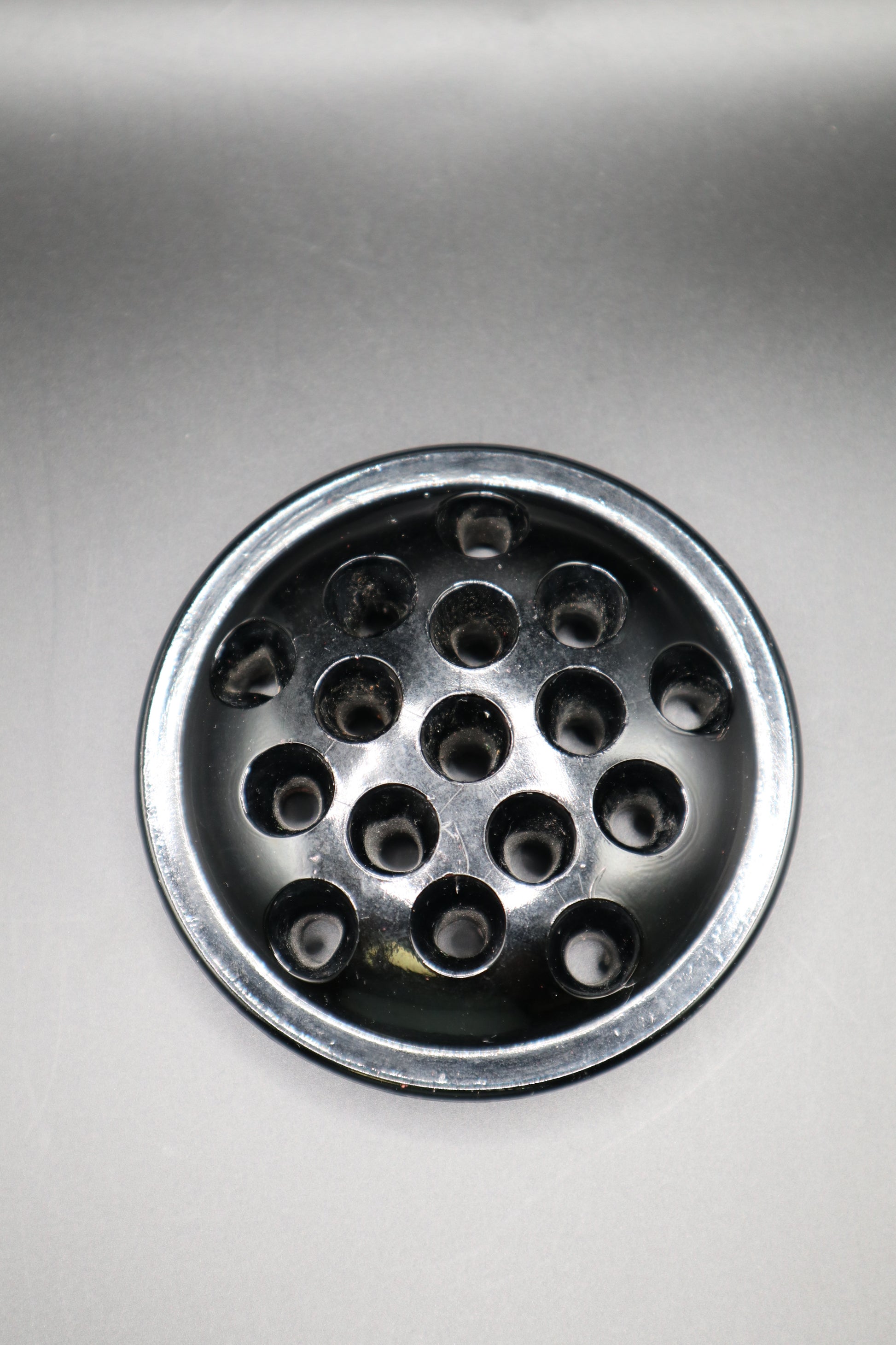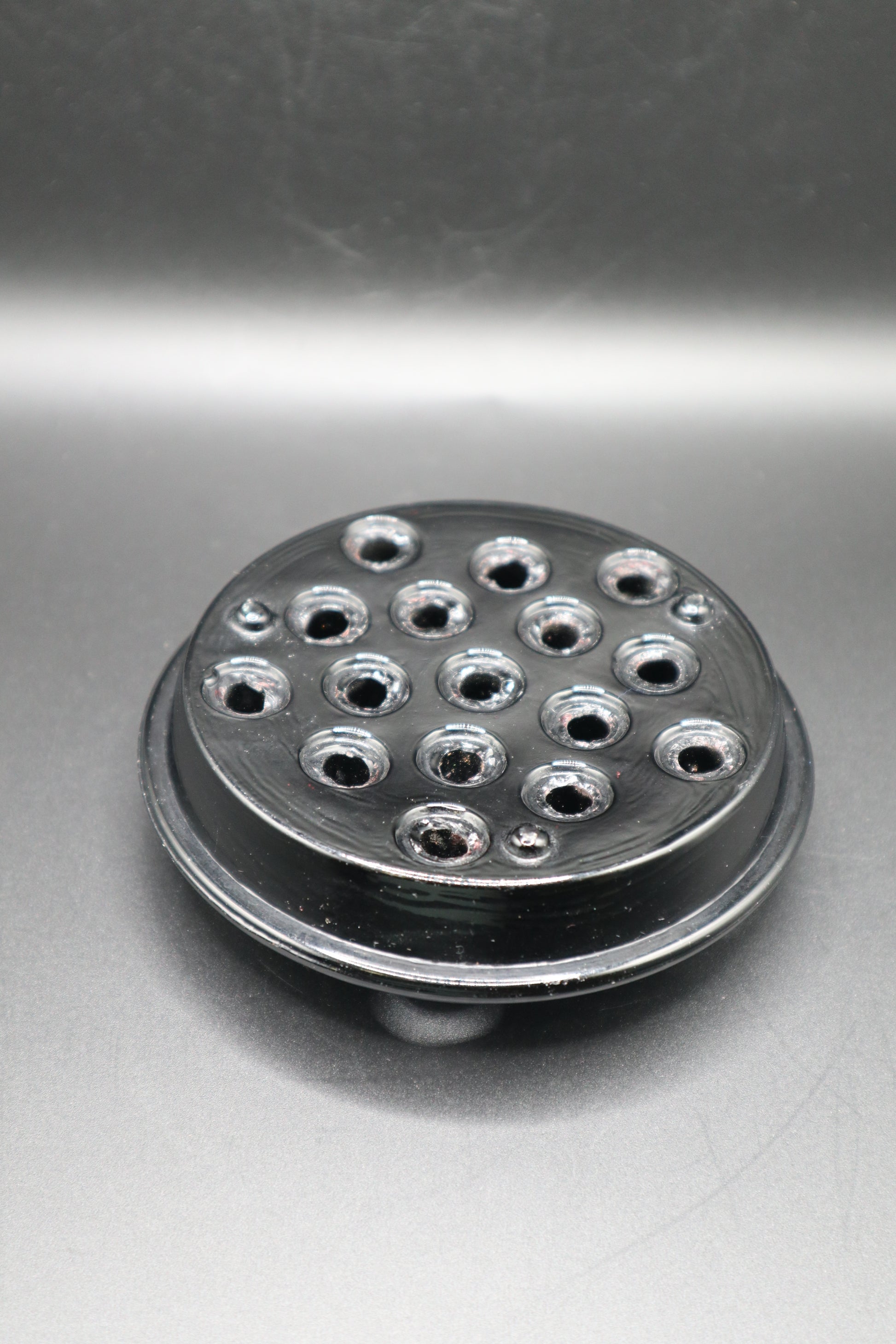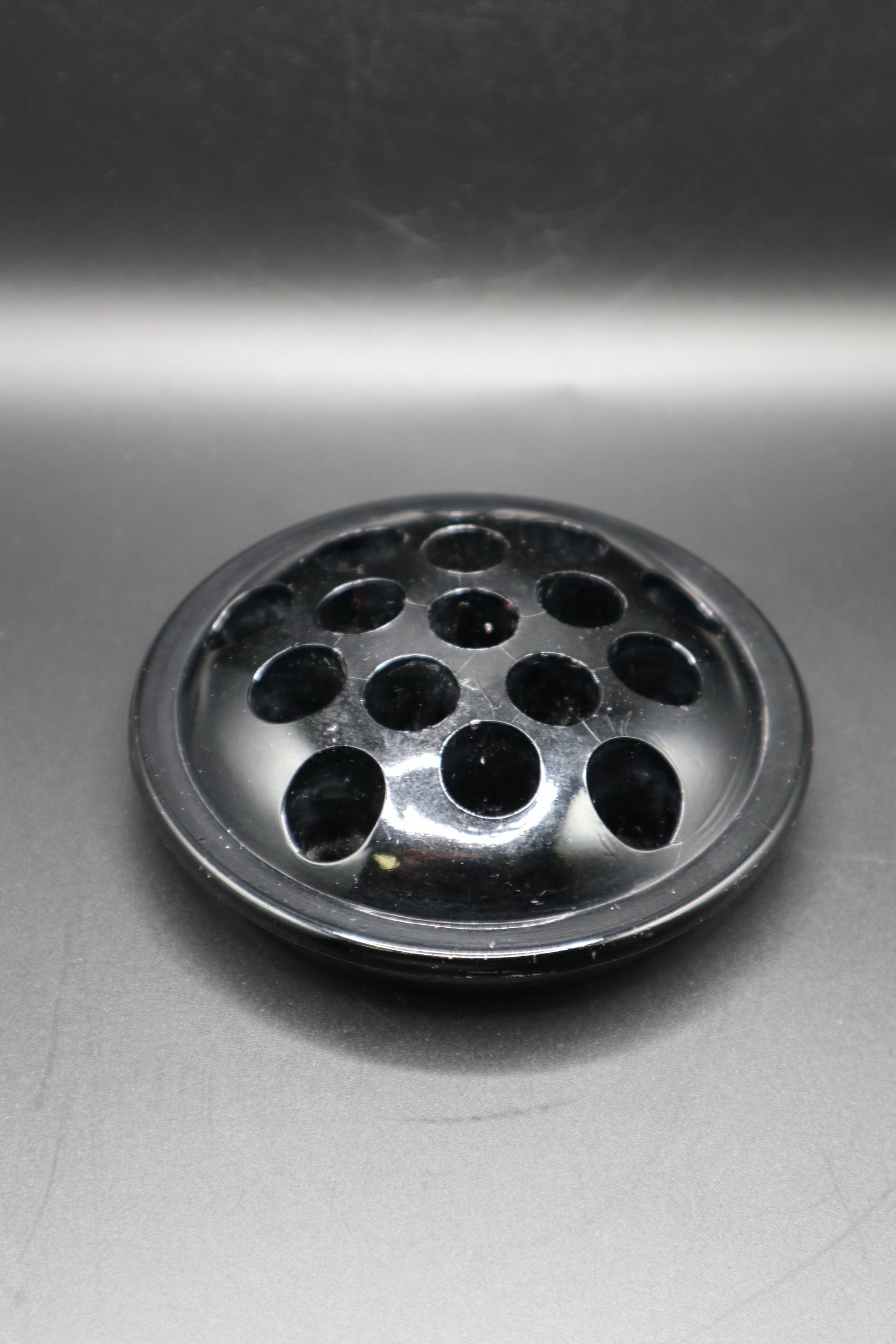 This vintage black glass flower frog is a refined piece for floral arrangement enthusiasts. Crafted from deep black glass, it offers sturdy support for stems, allowing you to create precise and elegant displays. Its timeless design not only serves a practical purpose but also adds a subtle decorative element to your vase or centerpiece. Ideal for collectors or those seeking classic floral accessories, this flower frog combines function and vintage charm in one sophisticated item.