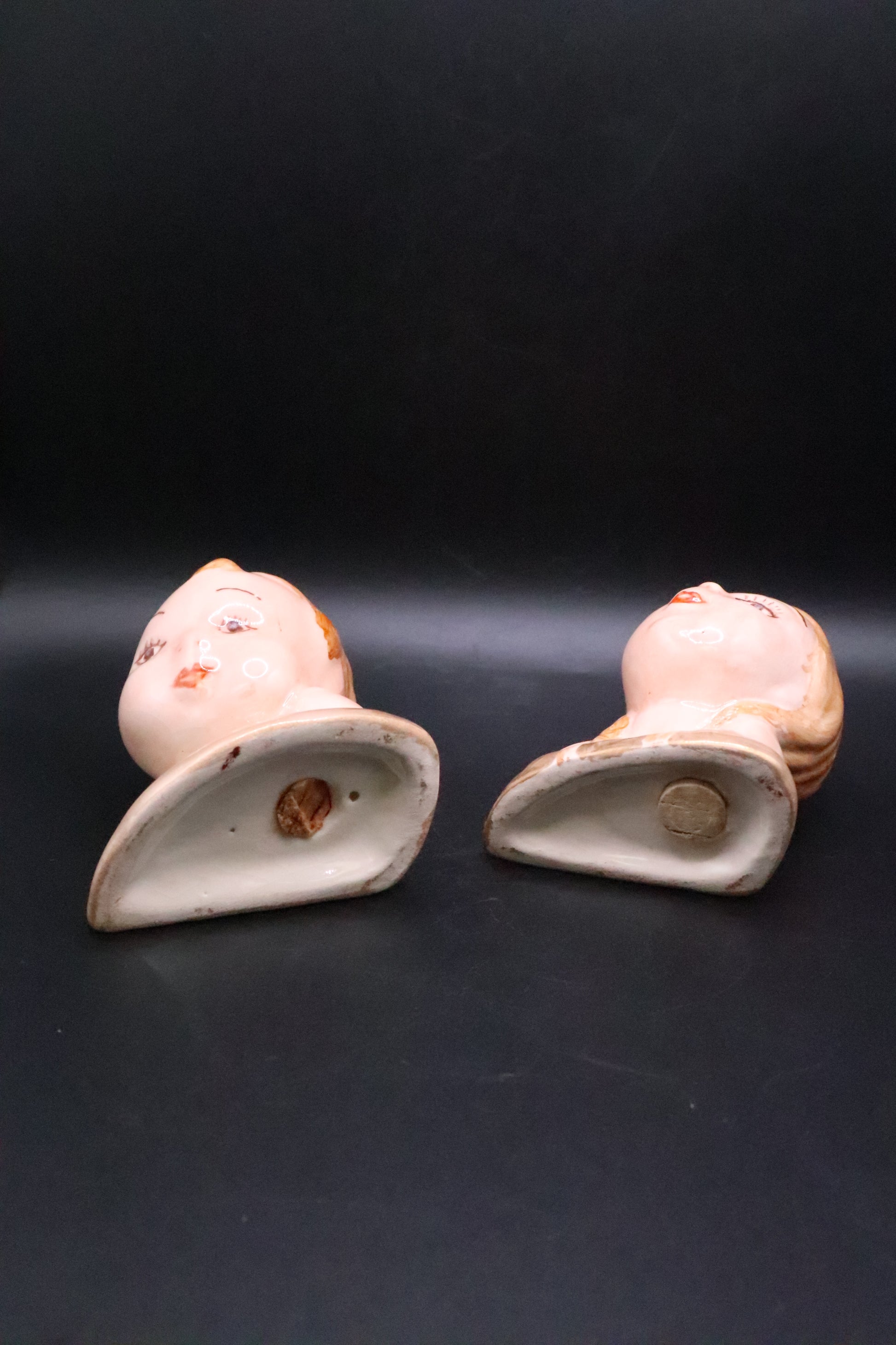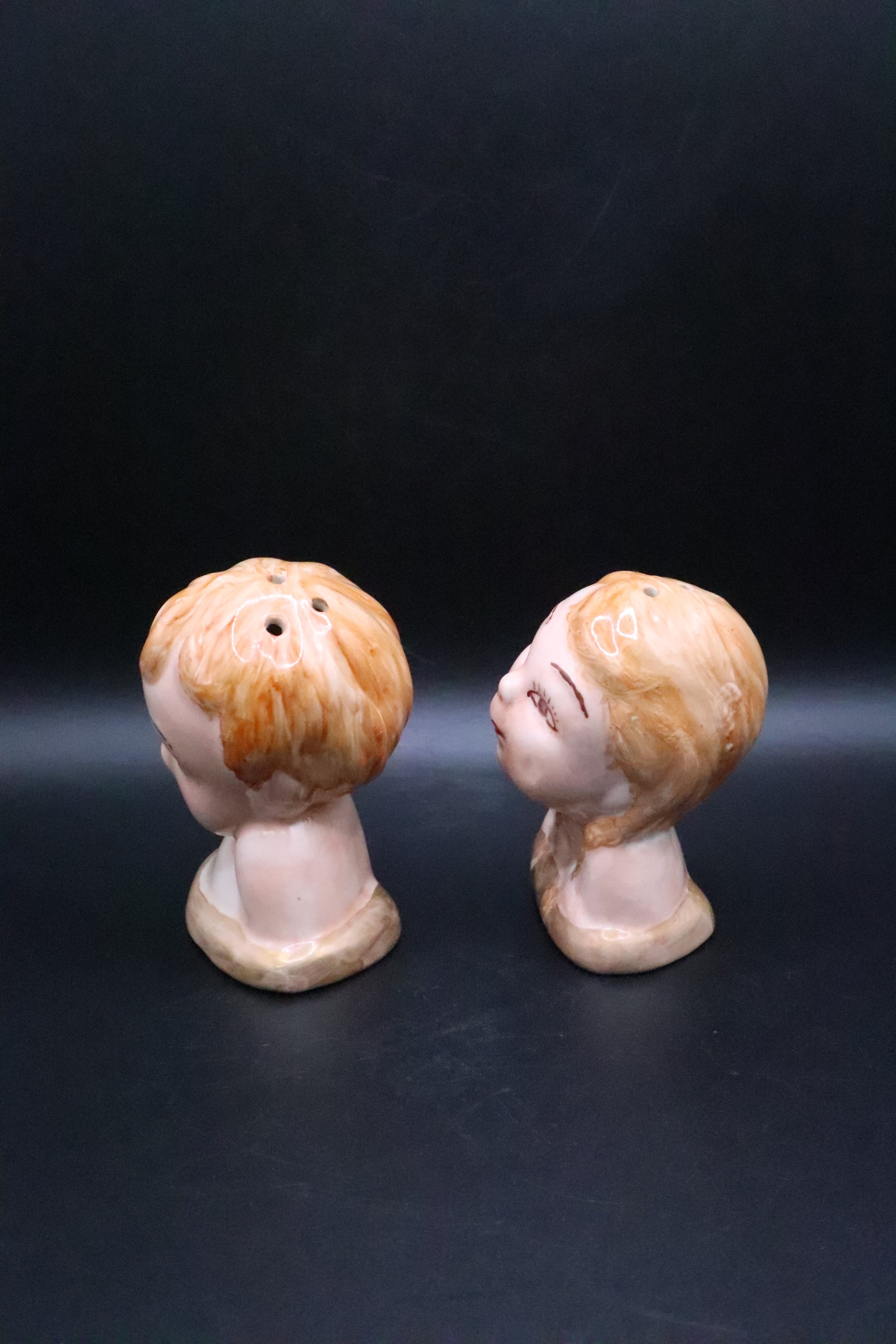 Charming pair of vintage ceramic bust salt and pepper shakers depicting a boy and girl. Crafted with fine detail, these collectible pieces showcase the artisanal quality characteristic of mid-century ceramics. Each shaker features a sculpted head form with period-appropriate styling and hand-painted accents. Perfect for vintage tableware enthusiasts and collectors seeking authentic decorative serving pieces with nostalgic appeal. Excellent condition with functional shaker tops.
