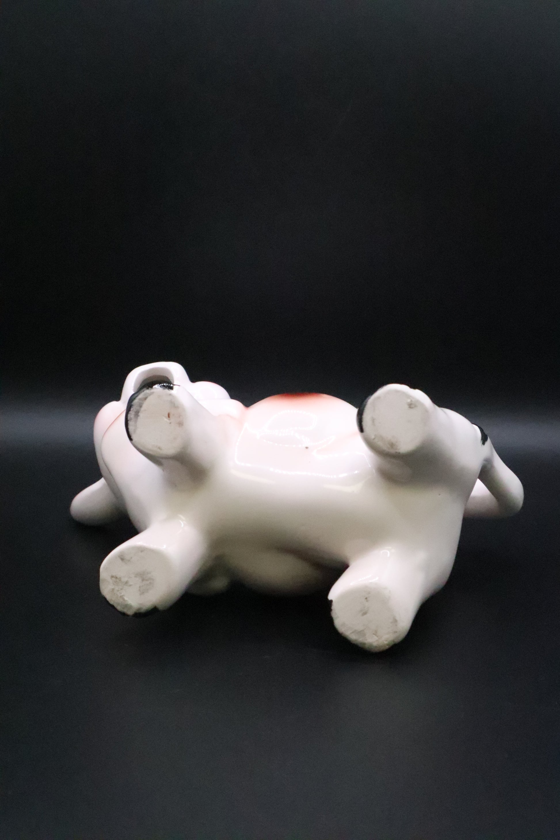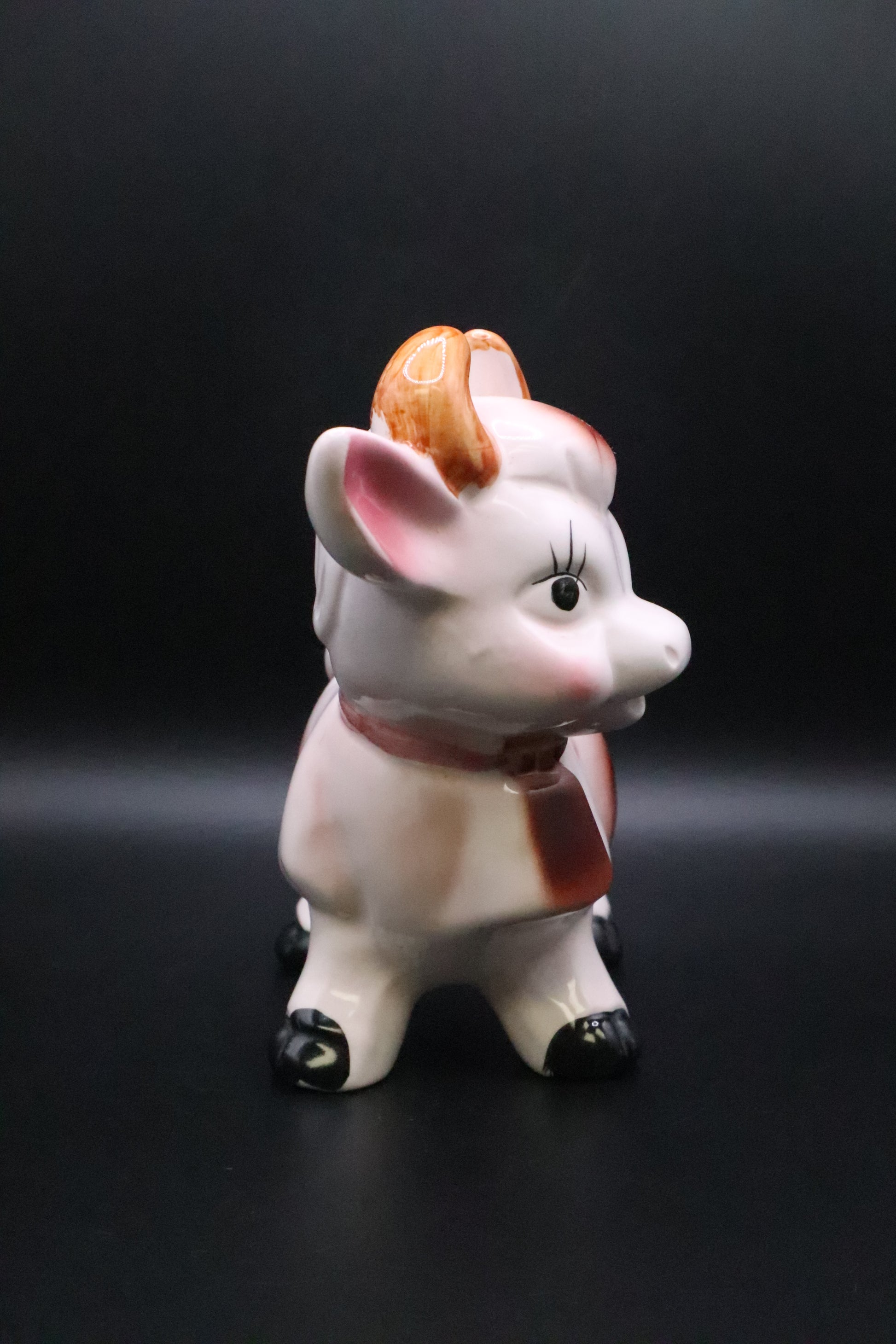 This charming vintage ceramic cow creamer showcases classic farmhouse appeal with its distinctive brown and white coloring. Hand-crafted with attention to detail, the piece features the cow's natural form as both functional serving vessel and decorative accent. Perfect for collectors of vintage dairy memorabilia or those seeking authentic mid-century kitchen charm. The creamer's generous capacity makes it ideal for serving cream at the table while adding nostalgic character to any collection. A delightful example of vintage ceramic craftsmanship that bridges utility and whimsy.