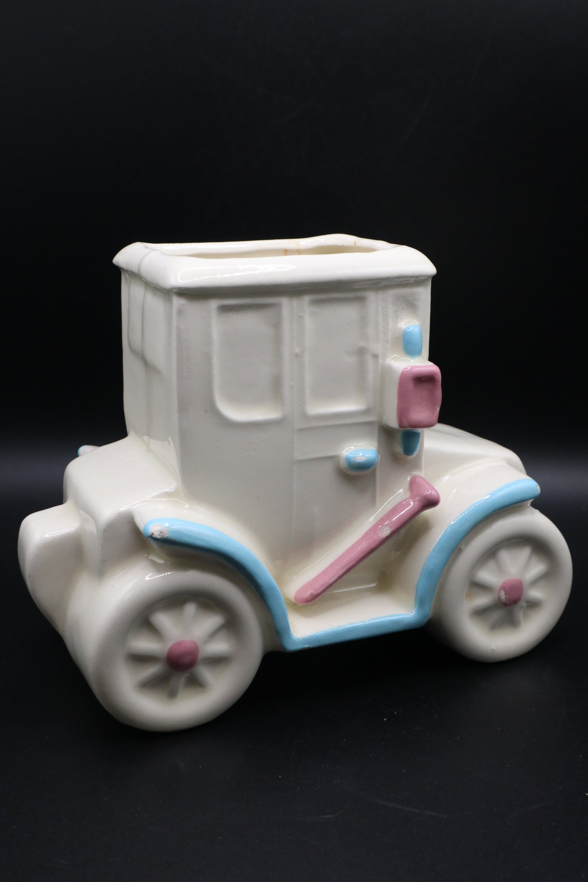 This vintage ceramic planter captures nostalgic charm with its soft pastel hues and detailed nursery room Model T design. Perfect for showcasing small plants or succulents, it adds a delicate, classic touch to any indoor space. Its durable ceramic construction ensures longevity, making it both a decorative and functional piece for collectors and plant enthusiasts seeking timeless style.