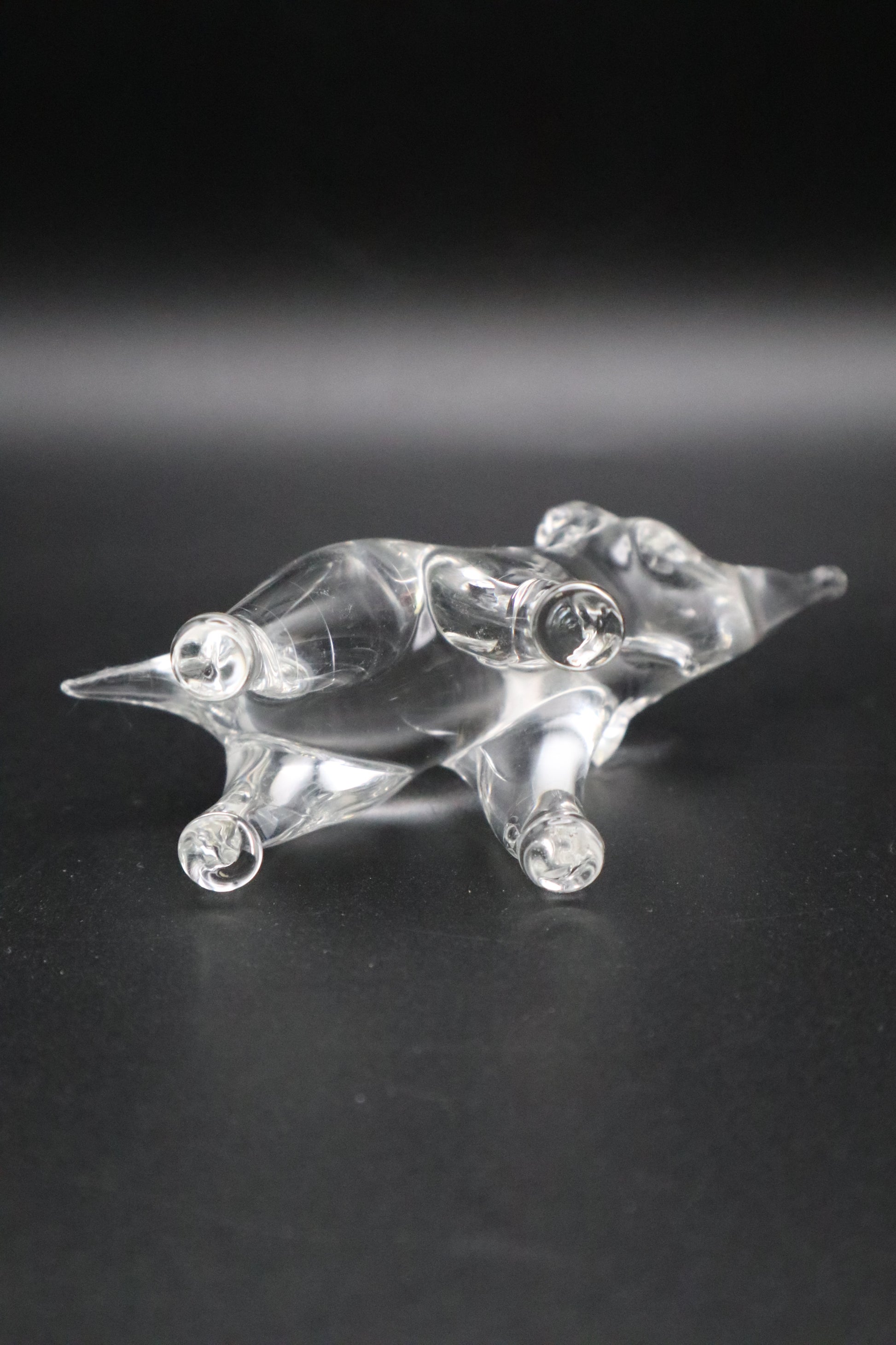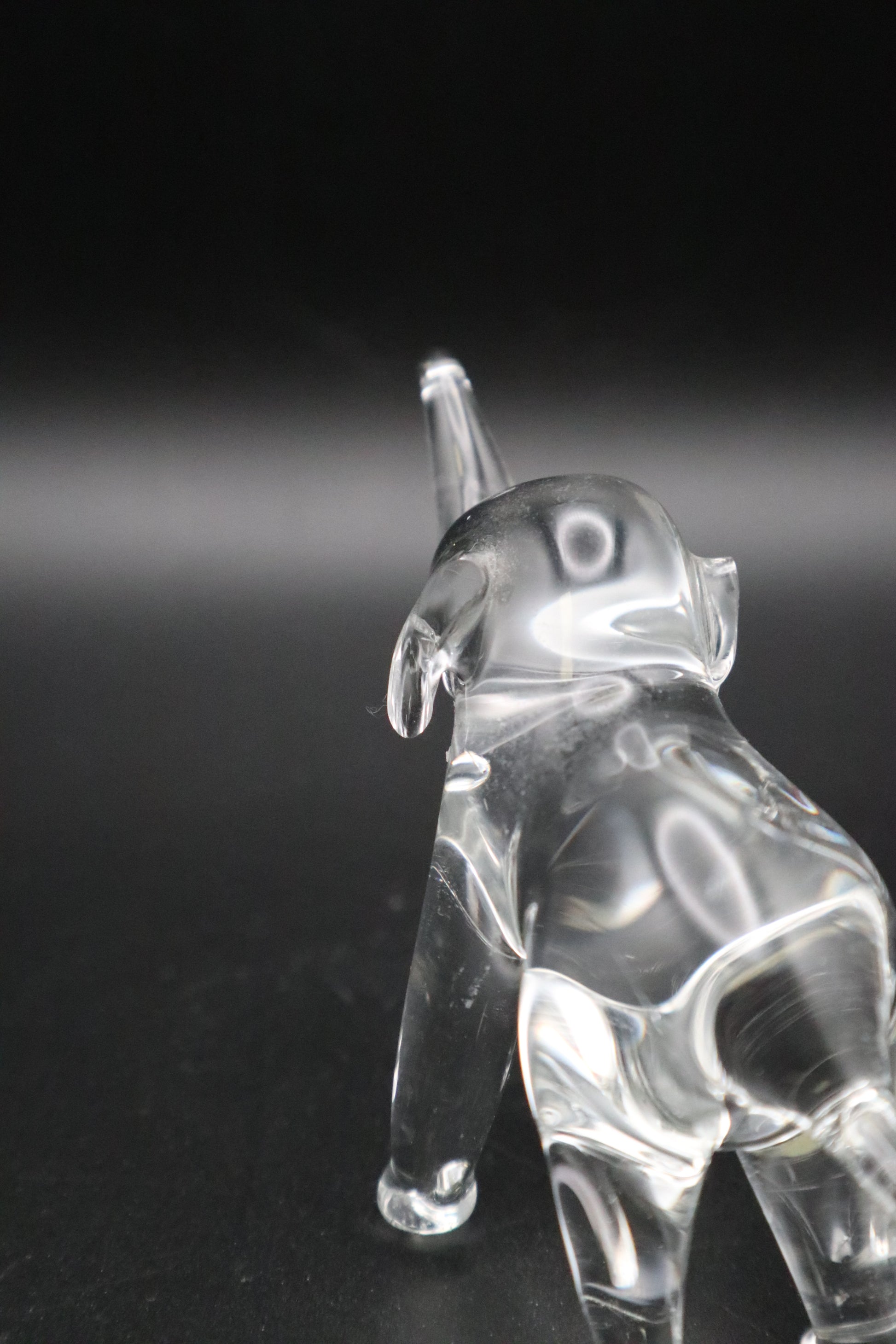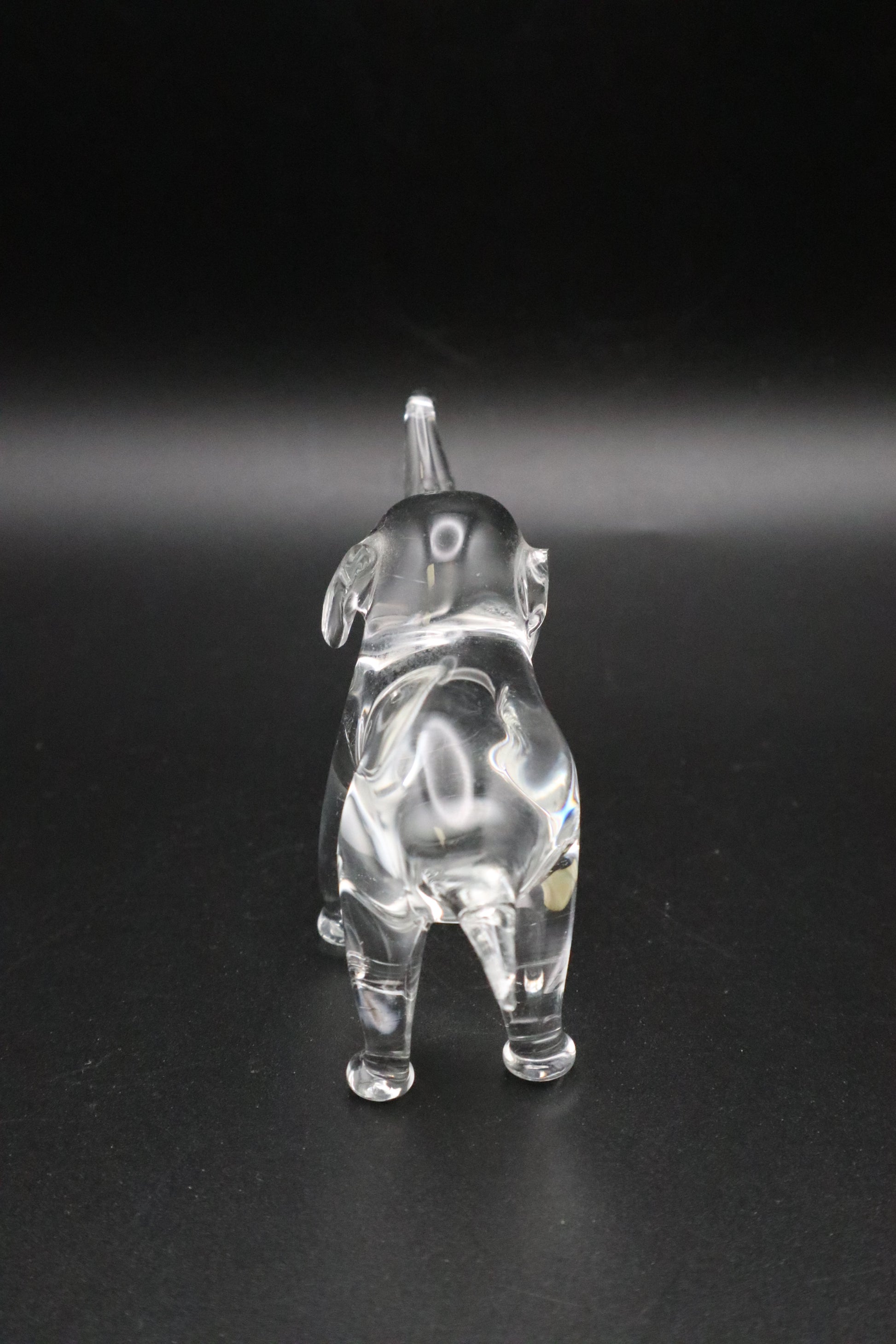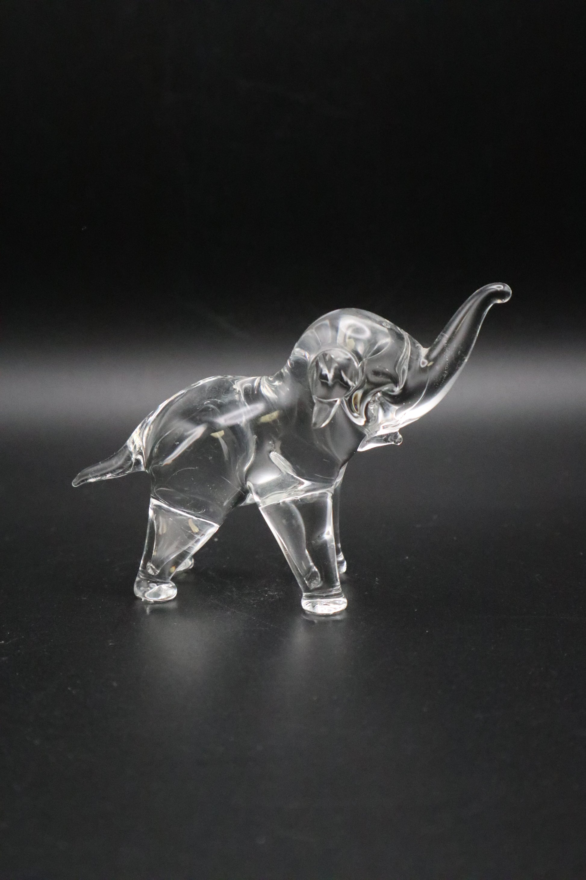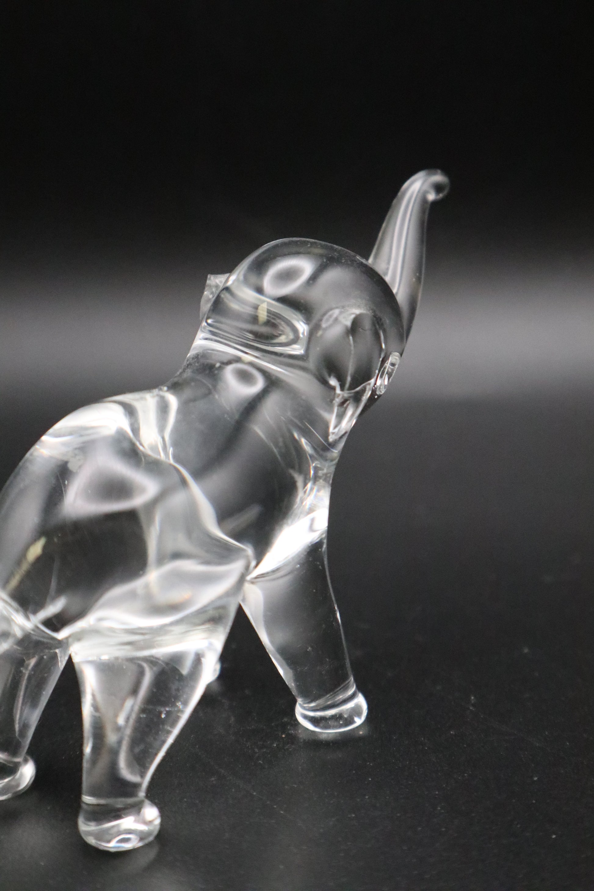 This vintage hand blown crystal art glass elephant showcases exceptional craftsmanship and timeless elegance. Each piece is uniquely formed by skilled artisans, highlighting the delicate translucency and clarity of fine crystal. Please note, this collectible features damage to the ears, which may affect its display or restoration options. Ideal for collectors and enthusiasts of art glass, it adds a sophisticated, classic touch to any curated collection.