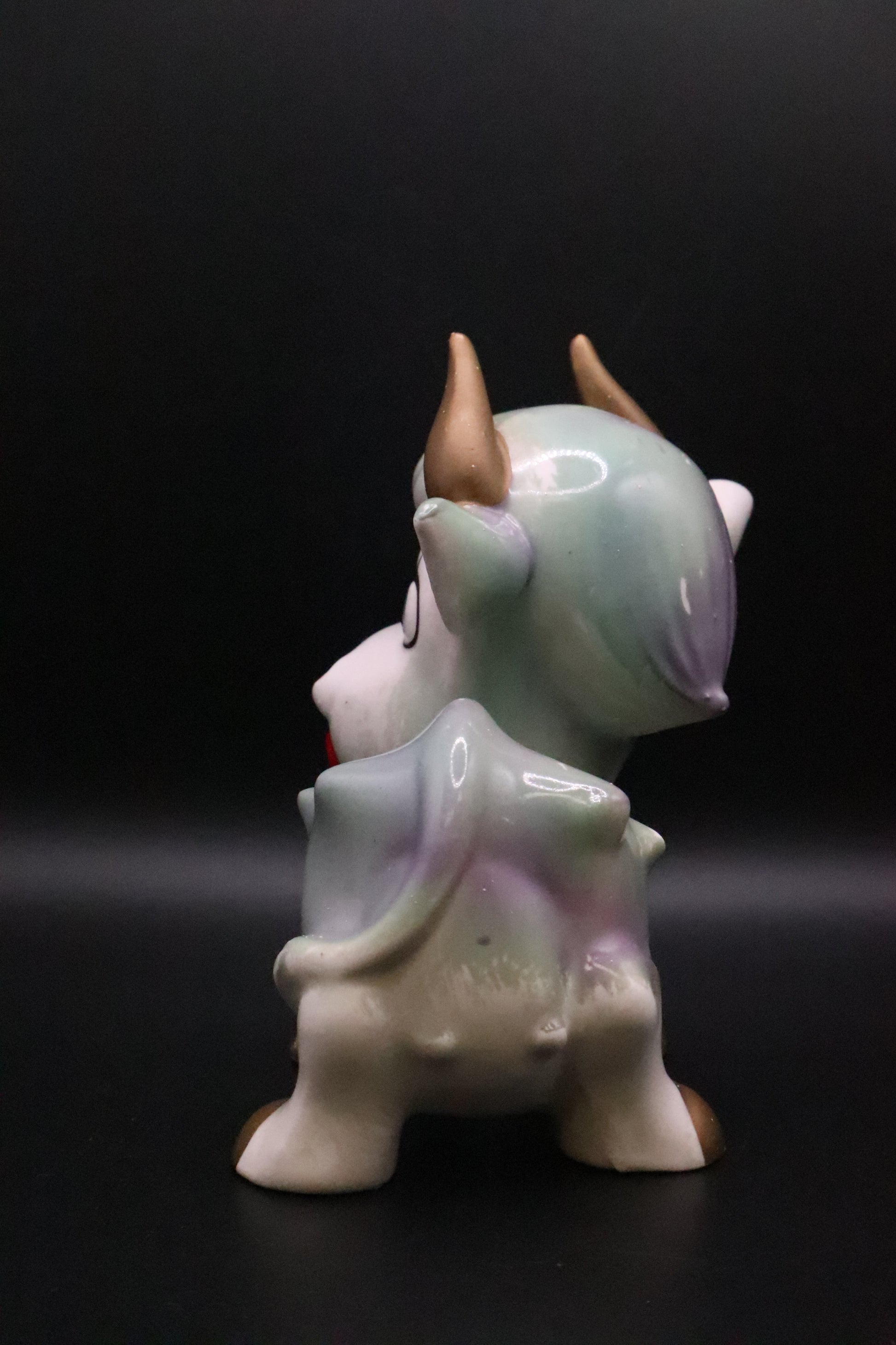 This charming vintage Japanese ceramic cow showcases the whimsical design sensibilities of mid-century artisans. Hand-crafted with anthropomorphic features, the piece captures a playful personality through expressive detailing and thoughtful proportions. The glazed ceramic construction displays authentic patina consistent with age, while the craftsmanship reflects the quality standards of Japanese pottery traditions. A delightful addition to collections of folk art, vintage ceramics, or anyone drawn to the intersection of functional design and artistic expression. Perfect for display on shelves, mantels, or as a conversation-starting accent piece.