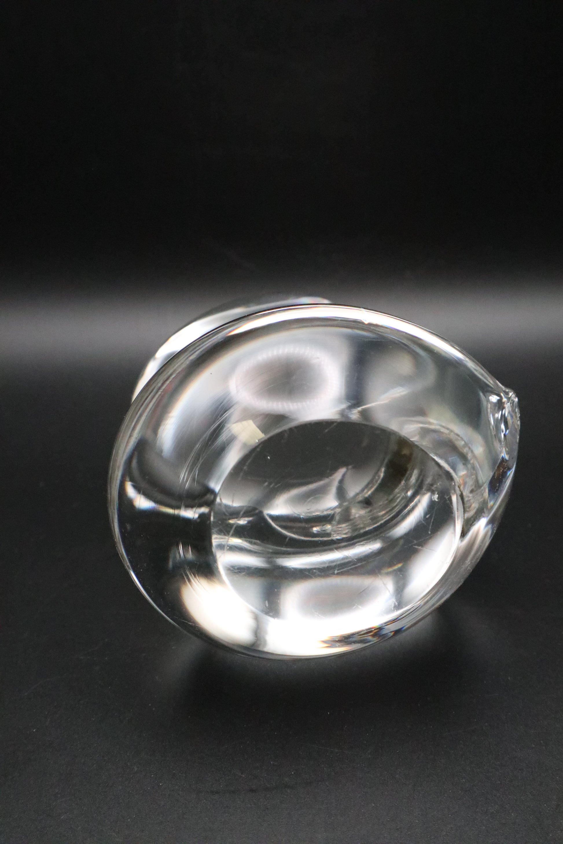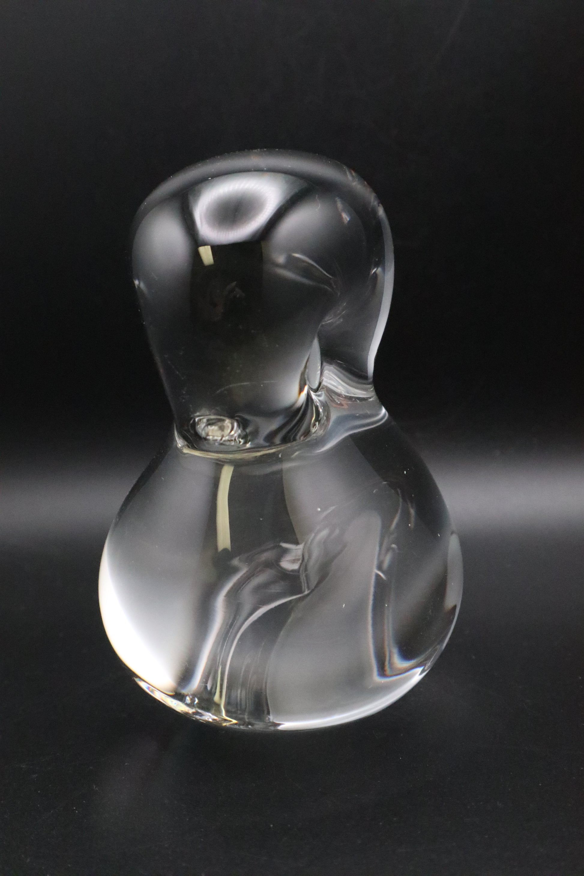 This vintage Konstglas paperweight from Sweden showcases expert craftsmanship in the form of a delicately sculpted glass duck. Its clear, smooth finish captures light beautifully, making it an elegant addition to any desk or display. Ideal for collectors or those appreciating Scandinavian glass art, this piece offers both functional weight and refined aesthetic charm.