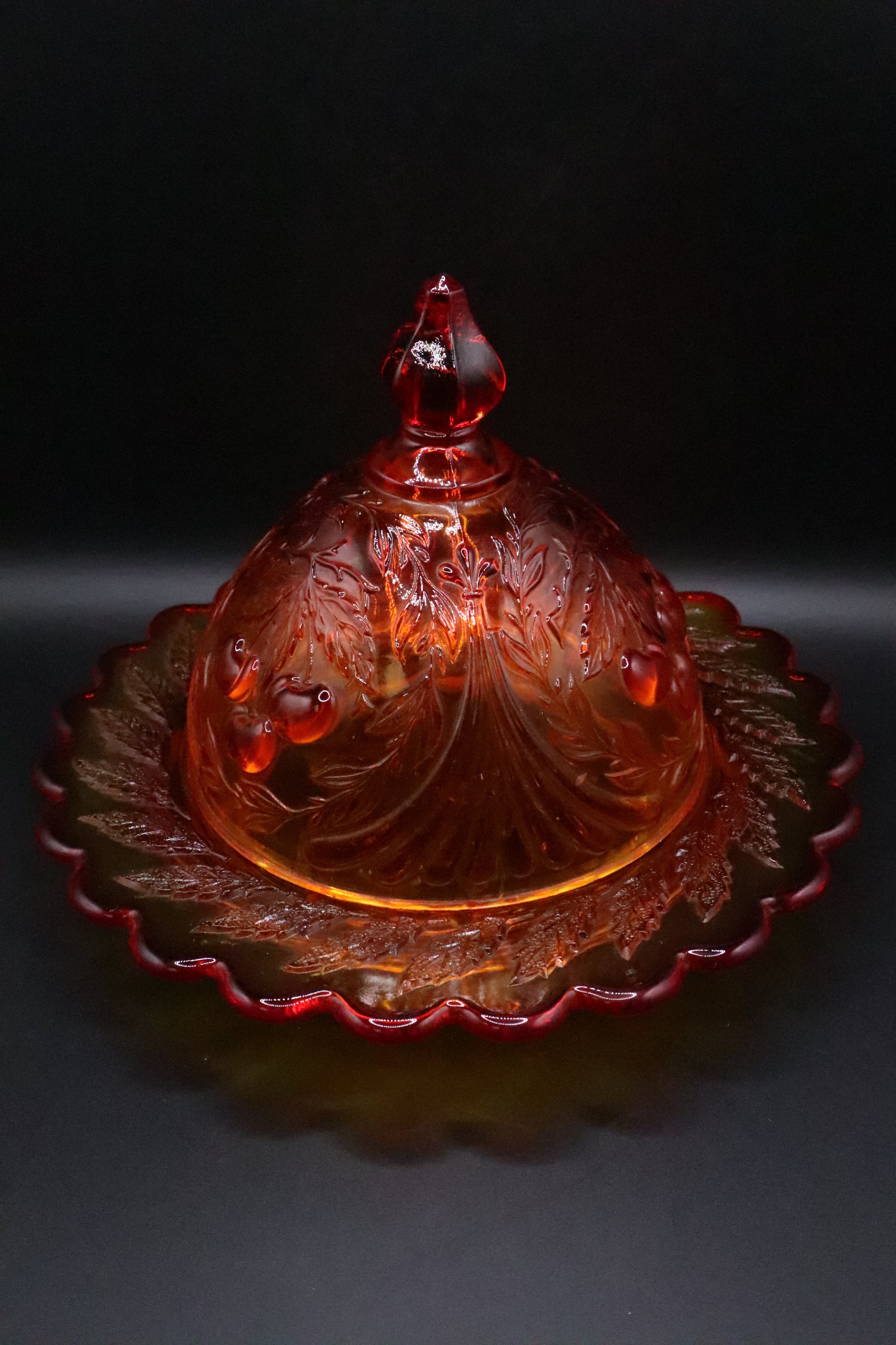 VINTAGE L.G. WRIGHT TREE CHERRY AMBERINA COVERED BUTTER DISH