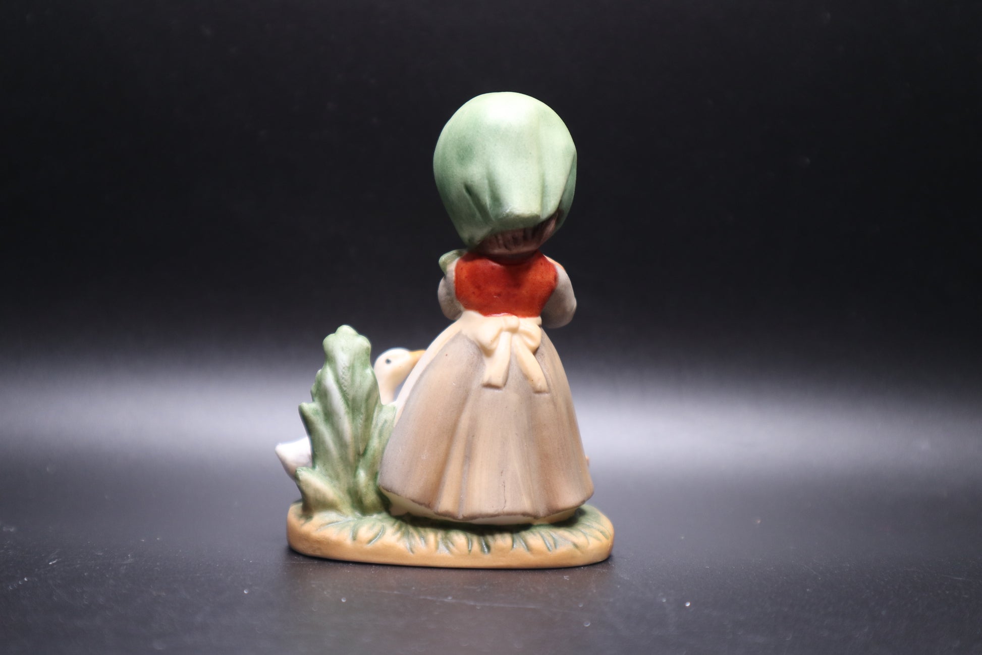 This vintage Napco Tiny Tot with Duck bisque figurine captures charming childhood innocence in delicate ceramic form. Known for Napco's fine craftsmanship, this collectible piece features detailed hand-painted accents and smooth bisque finish that adds warmth and nostalgia to any collection. Its petite size makes it perfect for display on shelves or curio cabinets, appealing to collectors of vintage ceramics and nostalgic décor enthusiasts alike. A timeless example of mid-century artistry and whimsy.