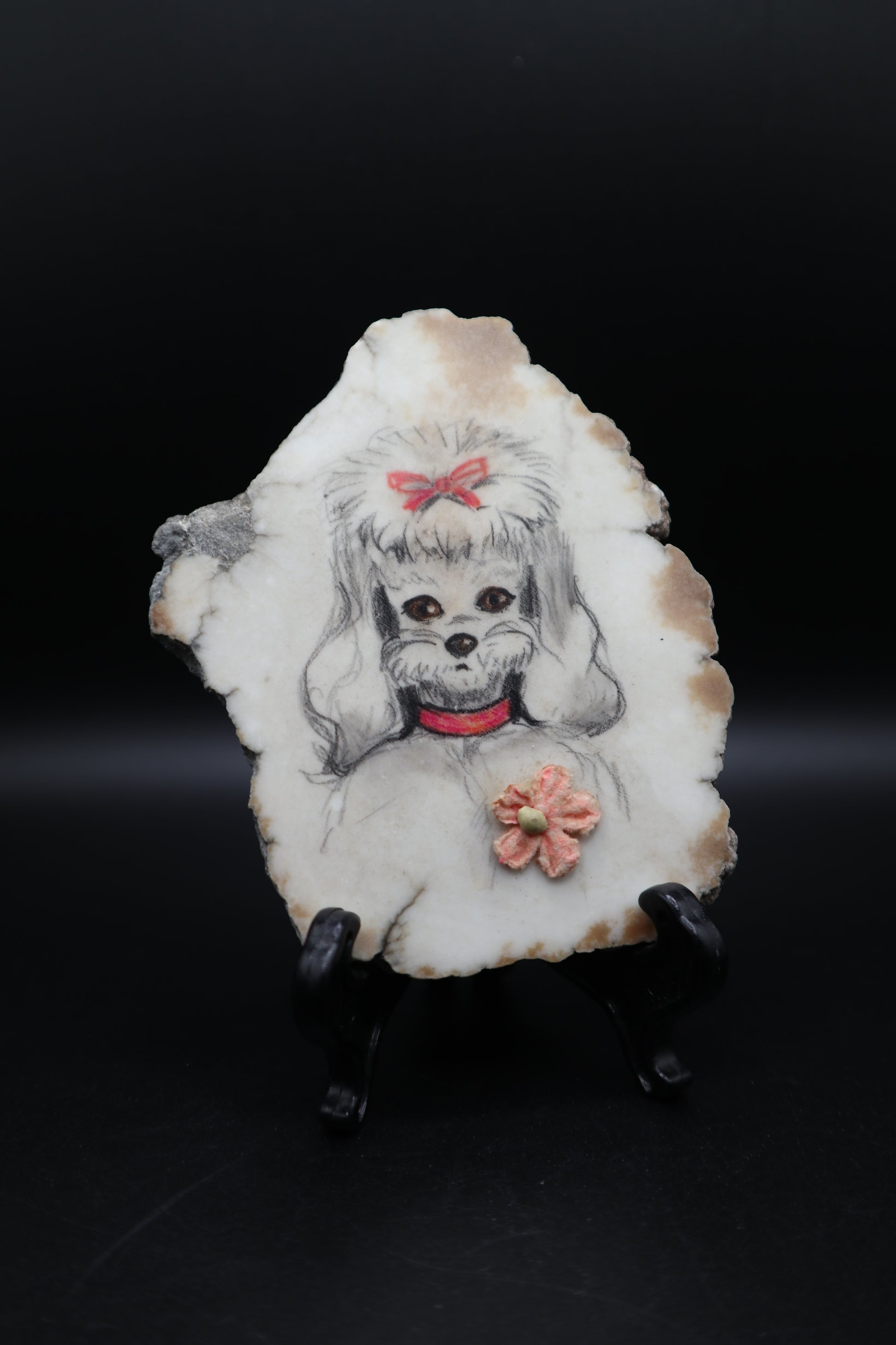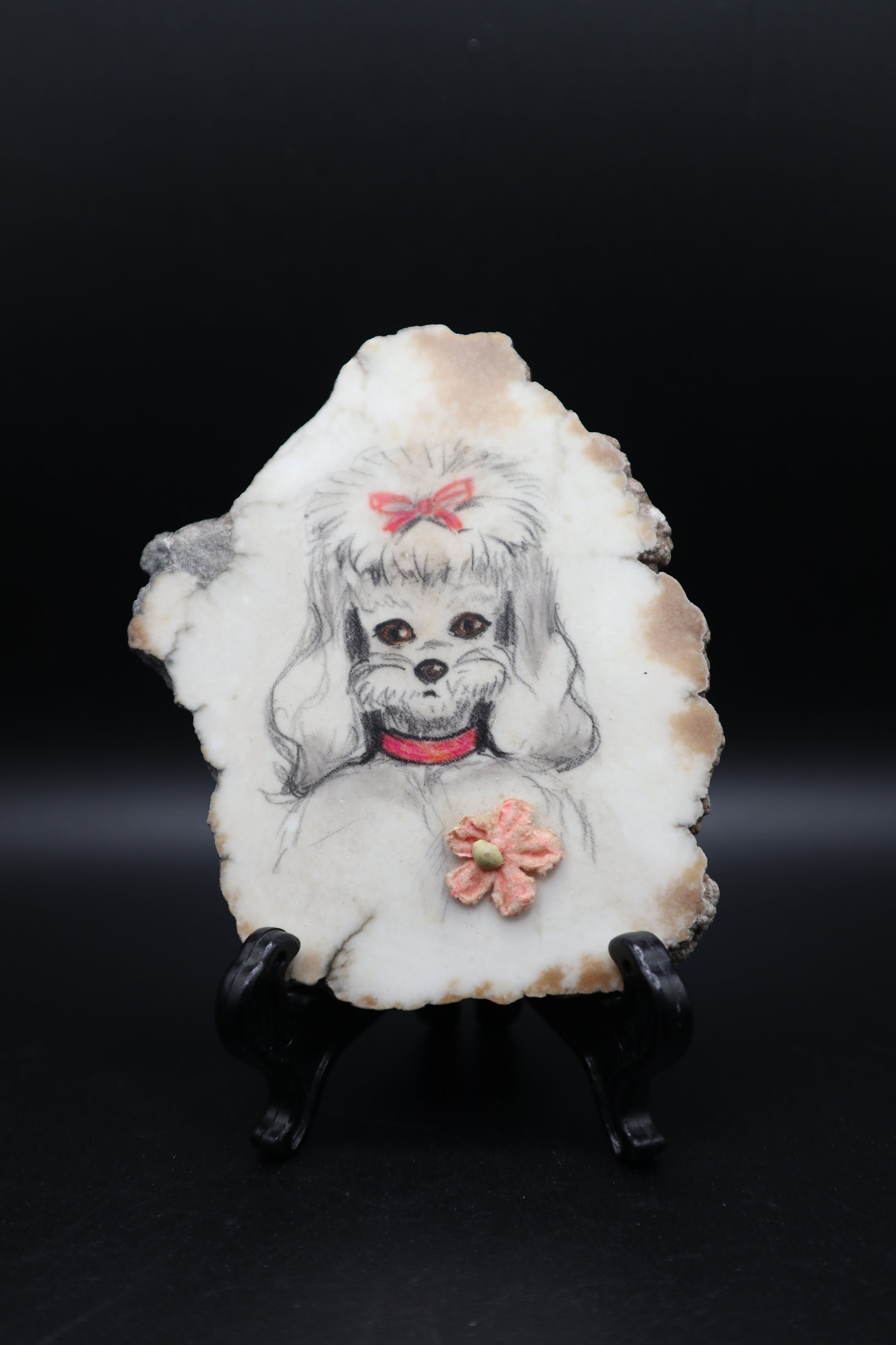 This vintage original poodle drawing on stone showcases skilled craftsmanship and timeless charm. The detailed illustration captures the classic elegance of the poodle, etched directly onto a natural stone surface, ensuring durability and a unique textured appearance. Perfect for collectors or lovers of vintage art, this piece combines artistic heritage with lasting quality, offering a distinctive accent to any space.