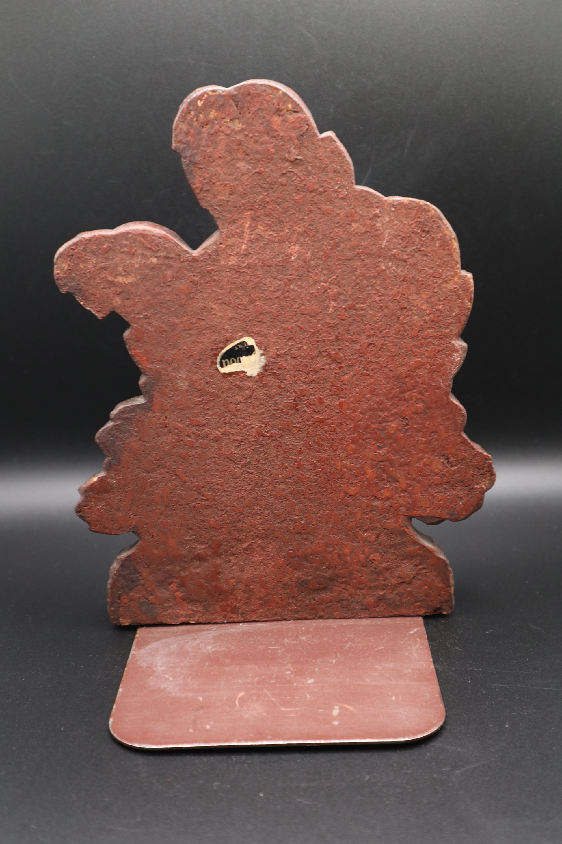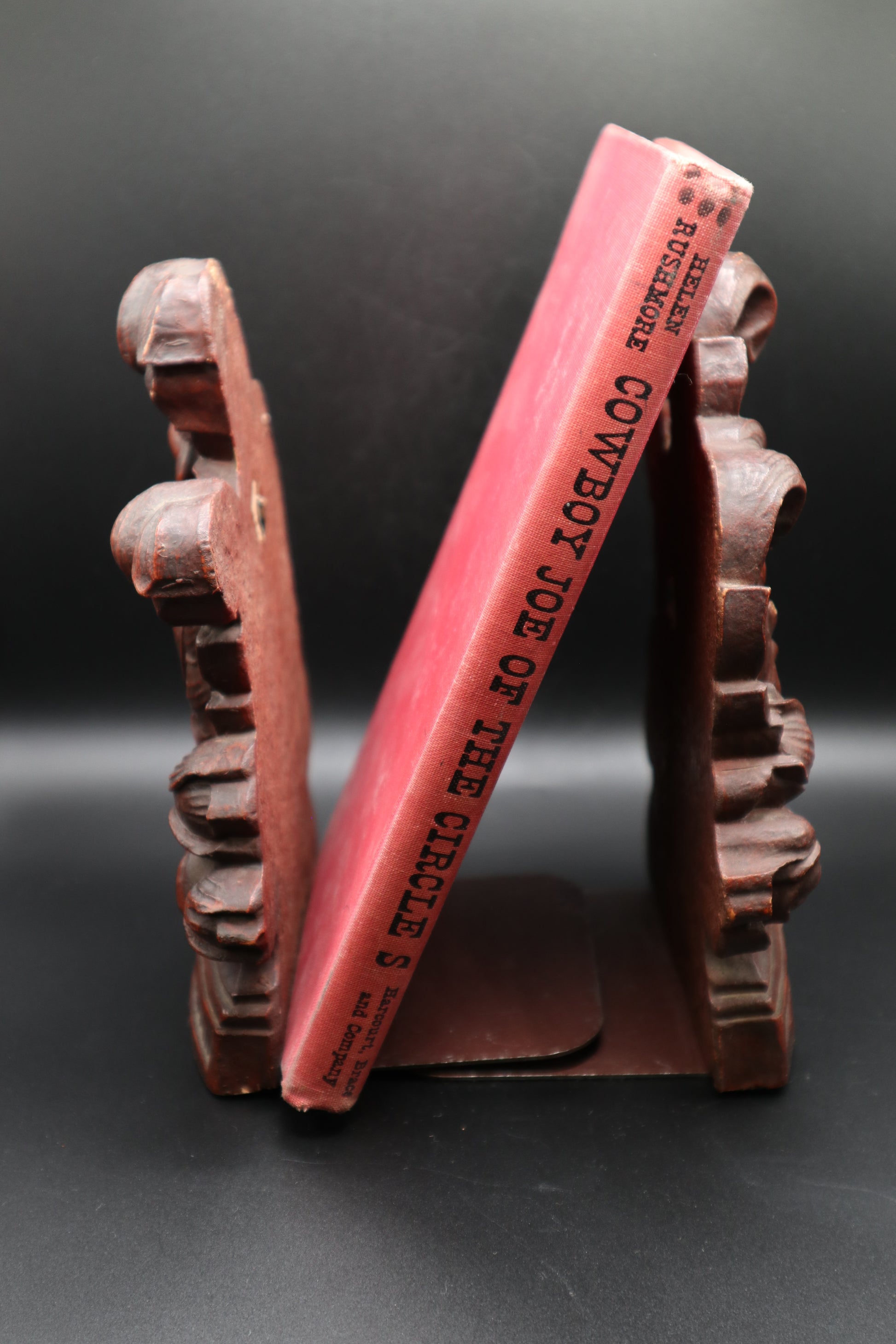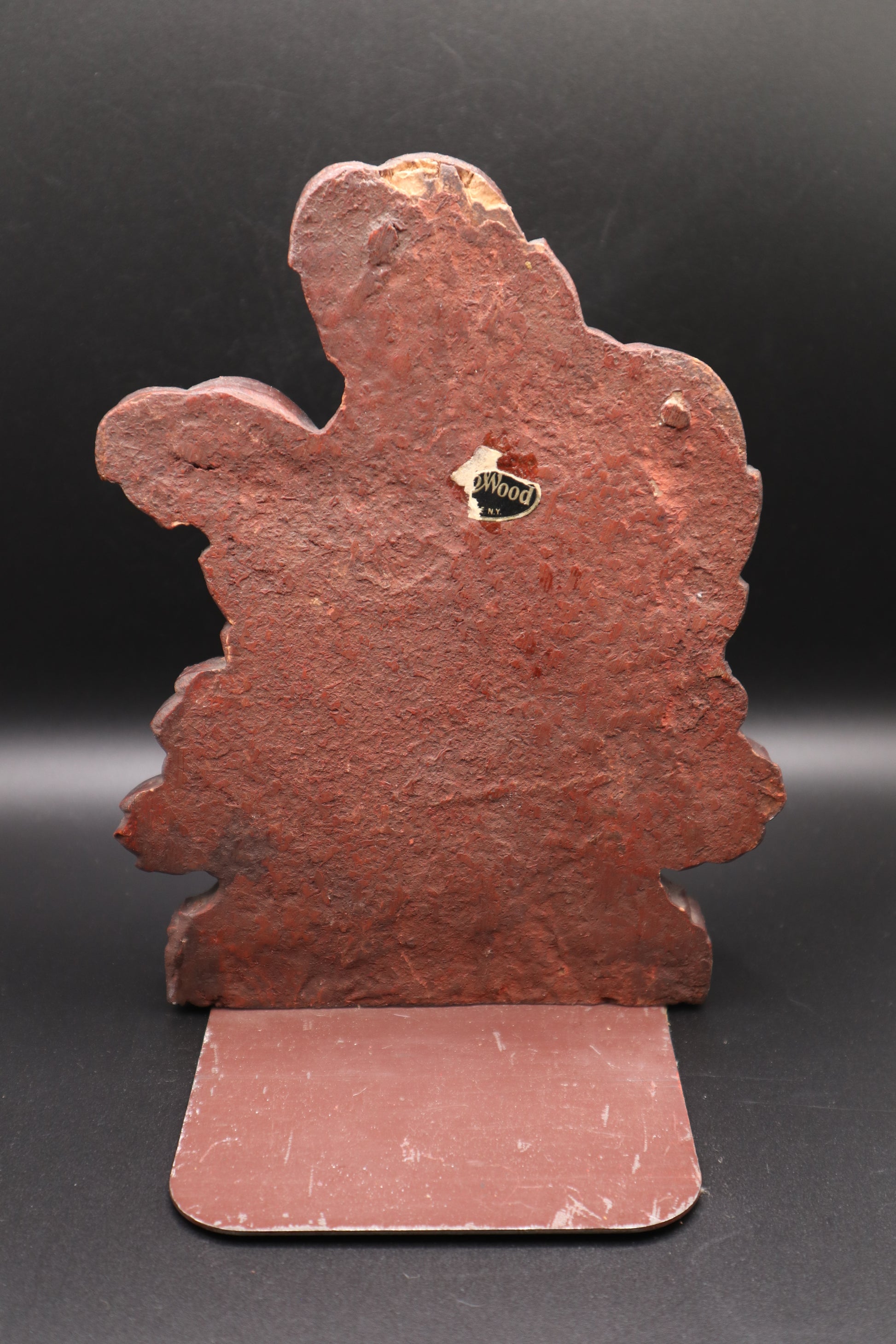 These vintage Syroco wood bookends feature intricate feather and tulip designs, showcasing craftsmanship typical of mid-20th century decorative art. Lightweight yet sturdy, they provide practical support for your books while adding a nuanced touch of classic elegance to any shelf or desk. Their detailed carvings and warm wood tones make them ideal for collectors and enthusiasts of authentic vintage decor.