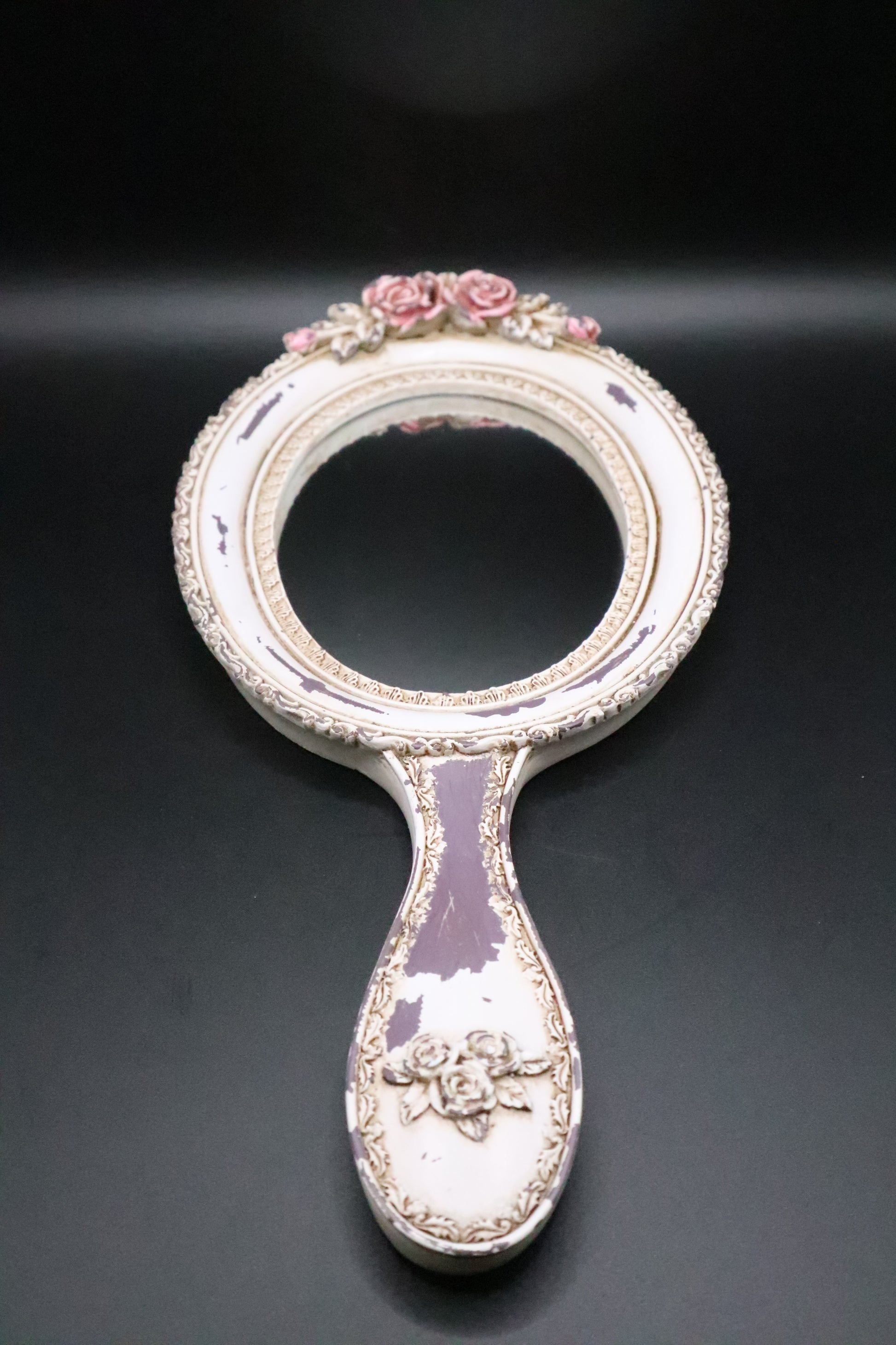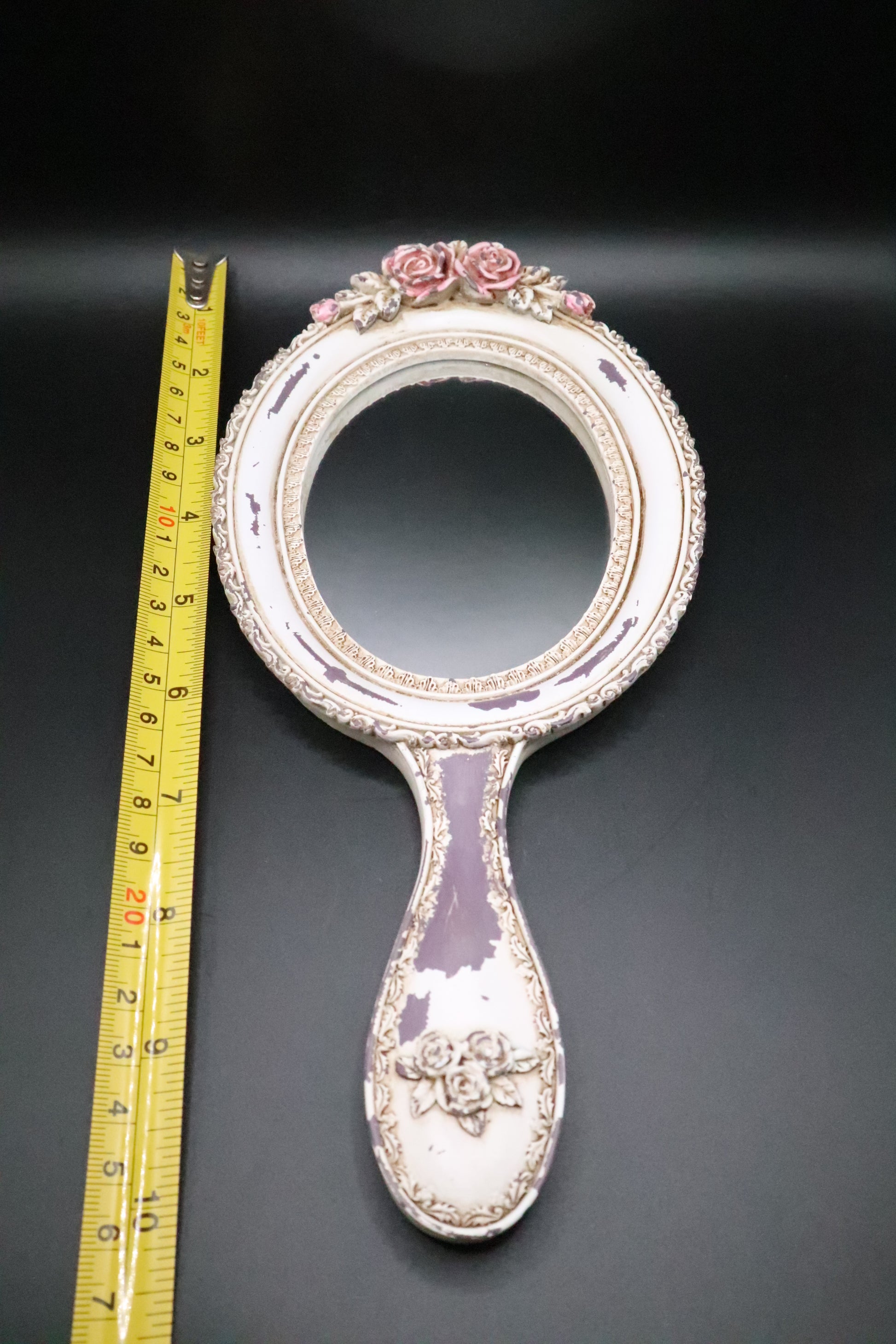 This exquisite hand-held mirror showcases delicate rose motifs characteristic of vintage vanity aesthetics. Crafted with period-appropriate detailing, the ornamental design reflects the elegance of classic dressing room accessories. The compact size makes it ideal for personal grooming or as a decorative accent piece. Perfect for collectors of vintage beauty items or those seeking authentic retro décor that captures timeless sophistication.